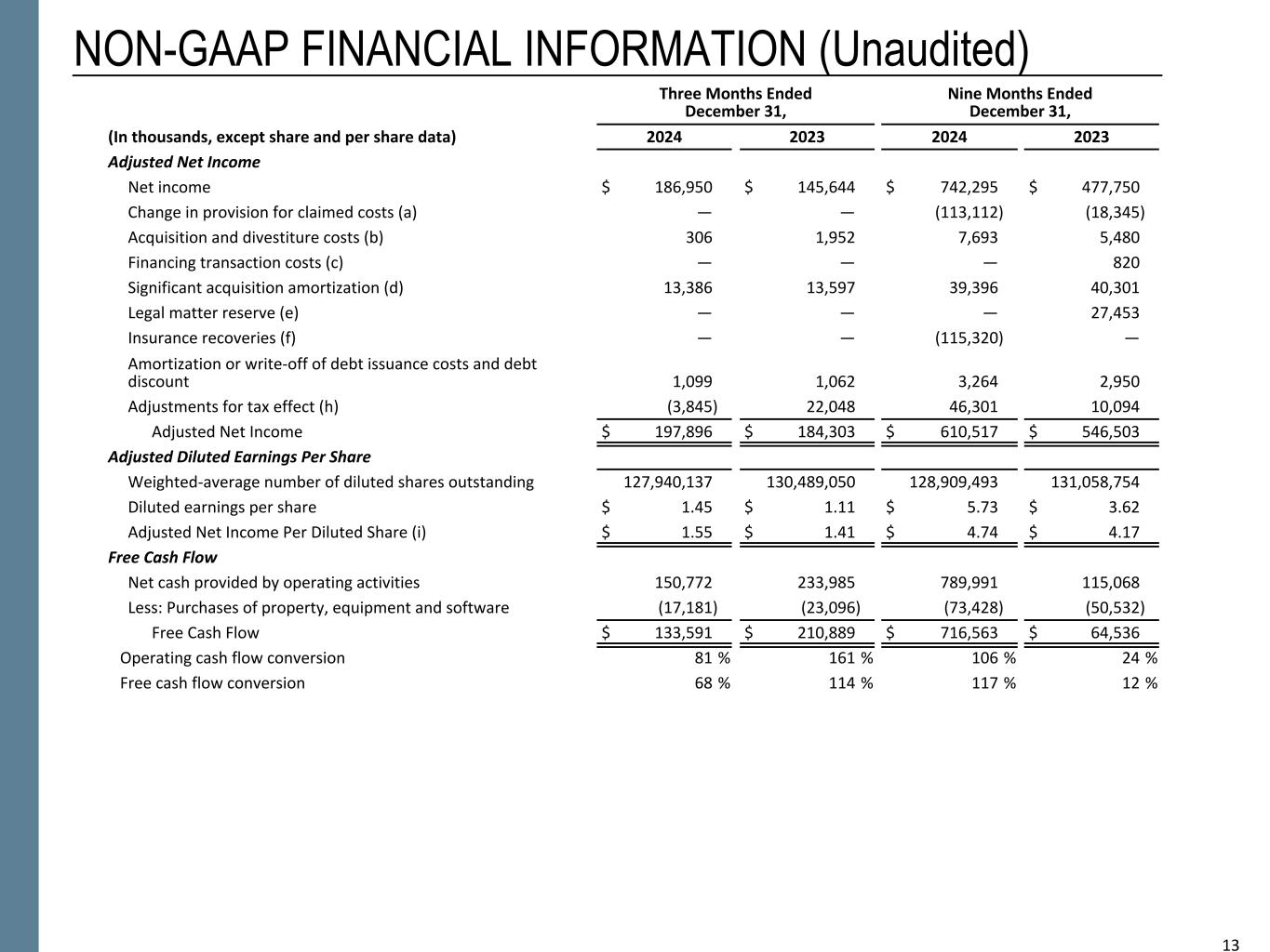 13 NON-GAAP FINANCIAL INFORMATION (Unaudited) Three Months Ended December 31, Nine Months Ended December 31, (In thousands, except share and per share data) 2024 2023 2024 2023 Adjusted Net Income Net income $ 186,950 $ 145,644 $ 742,295 $ 477,750 Change in provision for claimed costs (a) — — (113,112) (18,345) Acquisition and divestiture costs (b) 306 1,952 7,693 5,480 Financing transaction costs (c) — — — 820 Significant acquisition amortization (d) 13,386 13,597 39,396 40,301 Legal matter reserve (e) — — — 27,453 Insurance recoveries (f) — — (115,320) — Amortization or write-off of debt issuance costs and debt discount 1,099 1,062 3,264 2,950 Adjustments for tax effect (h) (3,845) 22,048 46,301 10,094 Adjusted Net Income $ 197,896 $ 184,303 $ 610,517 $ 546,503 Adjusted Diluted Earnings Per Share Weighted-average number of diluted shares outstanding 127,940,137 130,489,050 128,909,493 131,058,754 Diluted earnings per share $ 1.45 $ 1.11 $ 5.73 $ 3.62 Adjusted Net Income Per Diluted Share (i) $ 1.55 $ 1.41 $ 4.74 $ 4.17 Free Cash Flow Net cash provided by operating activities 150,772 233,985 789,991 115,068 Less: Purchases of property, equipment and software (17,181) (23,096) (73,428) (50,532) Free Cash Flow $ 133,591 $ 210,889 $ 716,563 $ 64,536 Operating cash flow conversion 81 % 161 % 106 % 24 % Free cash flow conversion 68 % 114 % 117 % 12 % 13