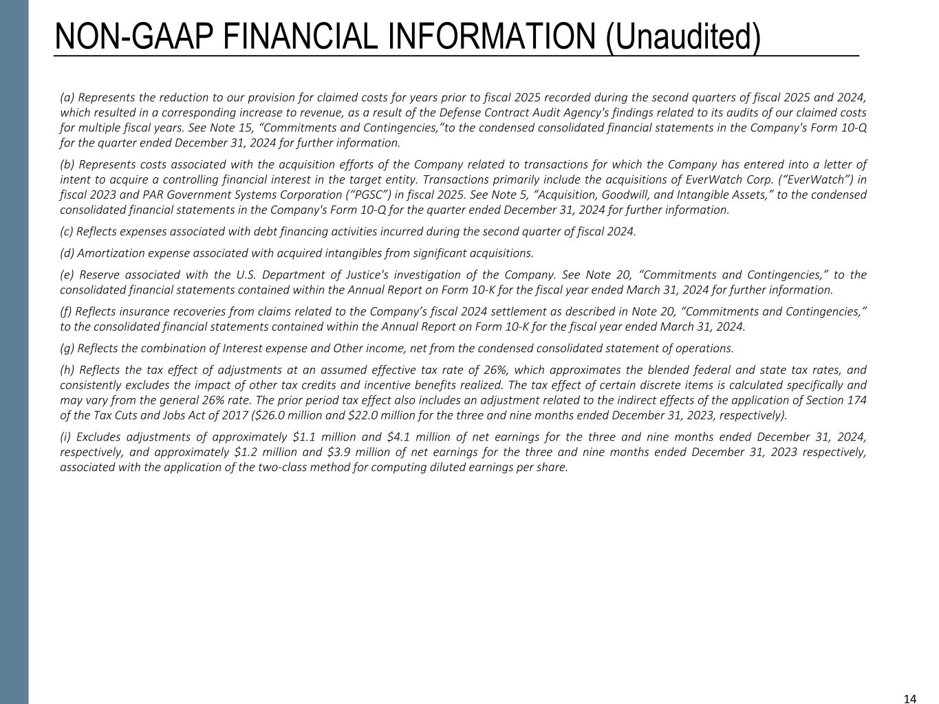 14 NON-GAAP FINANCIAL INFORMATION (Unaudited) 14 (a) Represents the reduction to our provision for claimed costs for years prior to fiscal 2025 recorded during the second quarters of fiscal 2025 and 2024, which resulted in a corresponding increase to revenue, as a result of the Defense Contract Audit Agency's findings related to its audits of our claimed costs for multiple fiscal years. See Note 15, “Commitments and Contingencies,”to the condensed consolidated financial statements in the Company's Form 10-Q for the quarter ended December 31, 2024 for further information. (b) Represents costs associated with the acquisition efforts of the Company related to transactions for which the Company has entered into a letter of intent to acquire a controlling financial interest in the target entity. Transactions primarily include the acquisitions of EverWatch Corp. (“EverWatch”) in fiscal 2023 and PAR Government Systems Corporation (“PGSC”) in fiscal 2025. See Note 5, “Acquisition, Goodwill, and Intangible Assets,” to the condensed consolidated financial statements in the Company's Form 10-Q for the quarter ended December 31, 2024 for further information. (c) Reflects expenses associated with debt financing activities incurred during the second quarter of fiscal 2024. (d) Amortization expense associated with acquired intangibles from significant acquisitions. (e) Reserve associated with the U.S. Department of Justice's investigation of the Company. See Note 20, “Commitments and Contingencies,” to the consolidated financial statements contained within the Annual Report on Form 10-K for the fiscal year ended March 31, 2024 for further information. (f) Reflects insurance recoveries from claims related to the Company’s fiscal 2024 settlement as described in Note 20, “Commitments and Contingencies,” to the consolidated financial statements contained within the Annual Report on Form 10-K for the fiscal year ended March 31, 2024. (g) Reflects the combination of Interest expense and Other income, net from the condensed consolidated statement of operations. (h) Reflects the tax effect of adjustments at an assumed effective tax rate of 26%, which approximates the blended federal and state tax rates, and consistently excludes the impact of other tax credits and incentive benefits realized. The tax effect of certain discrete items is calculated specifically and may vary from the general 26% rate. The prior period tax effect also includes an adjustment related to the indirect effects of the application of Section 174 of the Tax Cuts and Jobs Act of 2017 ($26.0 million and $22.0 million for the three and nine months ended December 31, 2023, respectively). (i) Excludes adjustments of approximately $1.1 million and $4.1 million of net earnings for the three and nine months ended December 31, 2024, respectively, and approximately $1.2 million and $3.9 million of net earnings for the three and nine months ended December 31, 2023 respectively, associated with the application of the two-class method for computing diluted earnings per share.