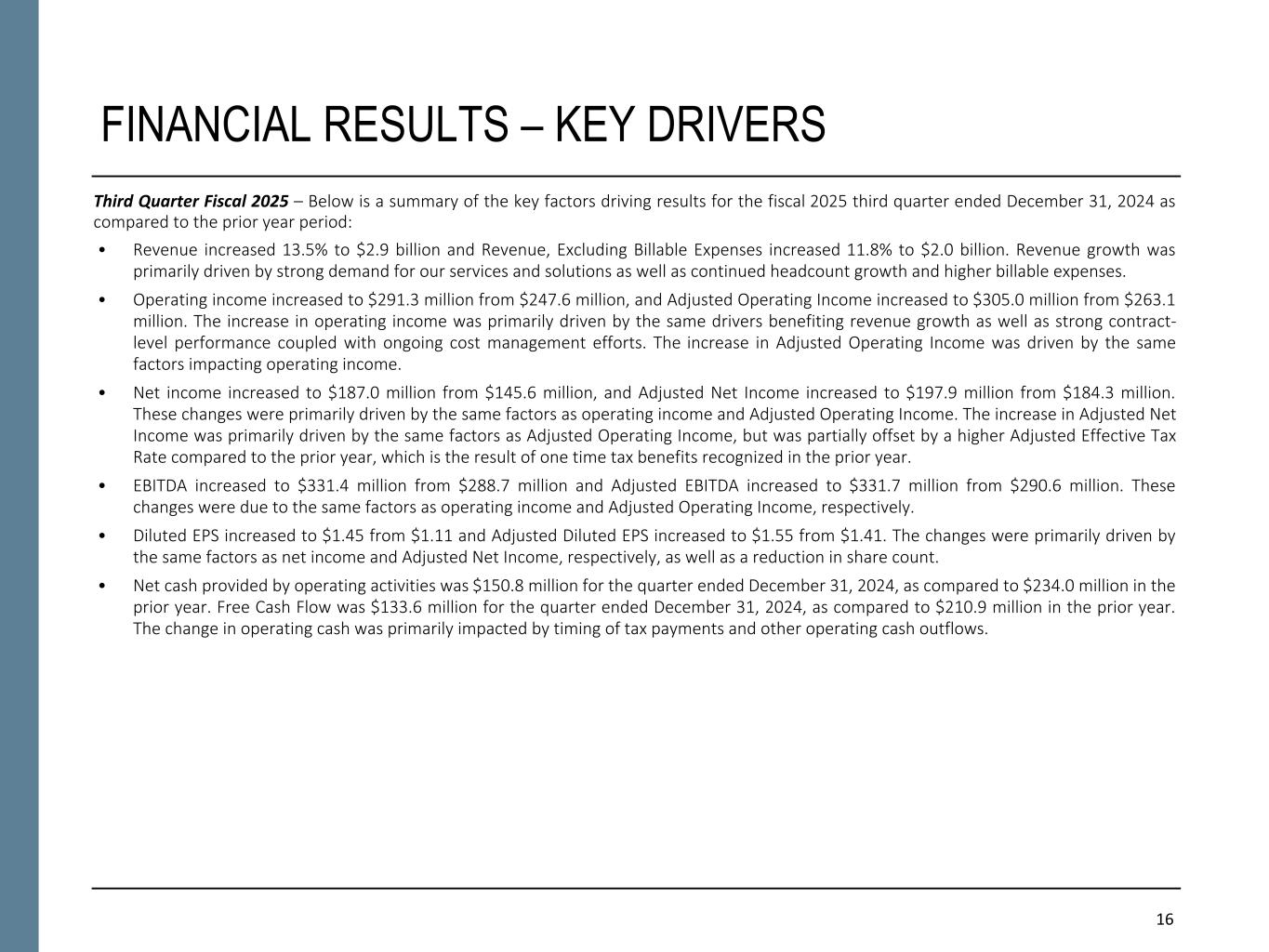 16 FINANCIAL RESULTS – KEY DRIVERS Third Quarter Fiscal 2025 – Below is a summary of the key factors driving results for the fiscal 2025 third quarter ended December 31, 2024 as compared to the prior year period: • Revenue increased 13.5% to $2.9 billion and Revenue, Excluding Billable Expenses increased 11.8% to $2.0 billion. Revenue growth was primarily driven by strong demand for our services and solutions as well as continued headcount growth and higher billable expenses. • Operating income increased to $291.3 million from $247.6 million, and Adjusted Operating Income increased to $305.0 million from $263.1 million. The increase in operating income was primarily driven by the same drivers benefiting revenue growth as well as strong contract- level performance coupled with ongoing cost management efforts. The increase in Adjusted Operating Income was driven by the same factors impacting operating income. • Net income increased to $187.0 million from $145.6 million, and Adjusted Net Income increased to $197.9 million from $184.3 million. These changes were primarily driven by the same factors as operating income and Adjusted Operating Income. The increase in Adjusted Net Income was primarily driven by the same factors as Adjusted Operating Income, but was partially offset by a higher Adjusted Effective Tax Rate compared to the prior year, which is the result of one time tax benefits recognized in the prior year. • EBITDA increased to $331.4 million from $288.7 million and Adjusted EBITDA increased to $331.7 million from $290.6 million. These changes were due to the same factors as operating income and Adjusted Operating Income, respectively. • Diluted EPS increased to $1.45 from $1.11 and Adjusted Diluted EPS increased to $1.55 from $1.41. The changes were primarily driven by the same factors as net income and Adjusted Net Income, respectively, as well as a reduction in share count. • Net cash provided by operating activities was $150.8 million for the quarter ended December 31, 2024, as compared to $234.0 million in the prior year. Free Cash Flow was $133.6 million for the quarter ended December 31, 2024, as compared to $210.9 million in the prior year. The change in operating cash was primarily impacted by timing of tax payments and other operating cash outflows.