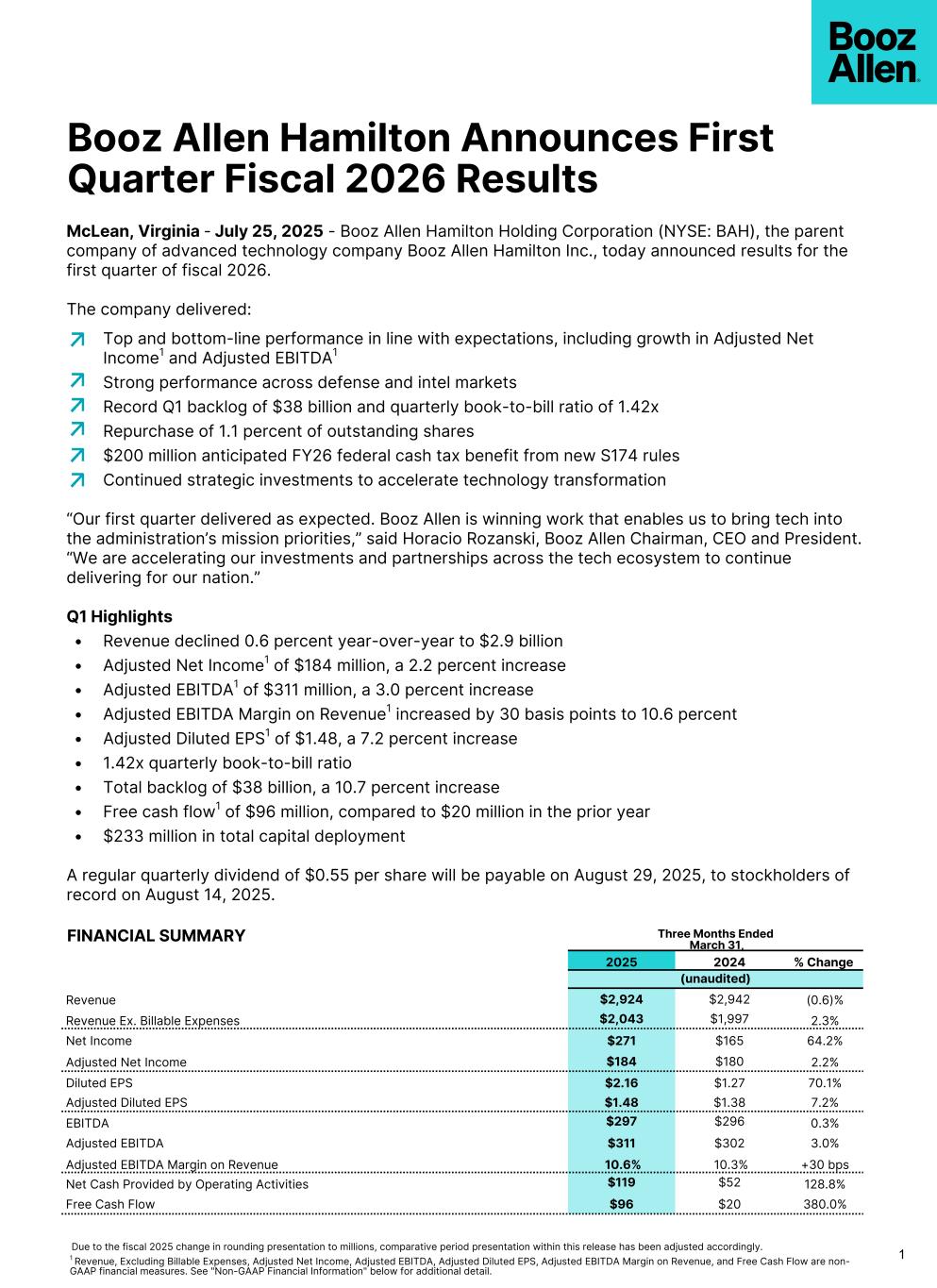 Booz Allen Hamilton Announces First Quarter Fiscal 2026 Results McLean, Virginia - July 25, 2025 - Booz Allen Hamilton Holding Corporation (NYSE: BAH), the parent company of advanced technology company Booz Allen Hamilton Inc., today announced results for the first quarter of fiscal 2026. The company delivered: Top and bottom-line performance in line with expectations, including growth in Adjusted Net Income1 and Adjusted EBITDA1 Strong performance across defense and intel markets Record Q1 backlog of $38 billion and quarterly book-to-bill ratio of 1.42x Repurchase of 1.1 percent of outstanding shares $200 million anticipated FY26 federal cash tax benefit from new S174 rules Continued strategic investments to accelerate technology transformation “Our first quarter delivered as expected. Booz Allen is winning work that enables us to bring tech into the administration’s mission priorities,” said Horacio Rozanski, Booz Allen Chairman, CEO and President. “We are accelerating our investments and partnerships across the tech ecosystem to continue delivering for our nation.” Q1 Highlights • Revenue declined 0.6 percent year-over-year to $2.9 billion • Adjusted Net Income1 of $184 million, a 2.2 percent increase • Adjusted EBITDA1 of $311 million, a 3.0 percent increase • Adjusted EBITDA Margin on Revenue1 increased by 30 basis points to 10.6 percent • Adjusted Diluted EPS1 of $1.48, a 7.2 percent increase • 1.42x quarterly book-to-bill ratio • Total backlog of $38 billion, a 10.7 percent increase • Free cash flow1 of $96 million, compared to $20 million in the prior year • $233 million in total capital deployment A regular quarterly dividend of $0.55 per share will be payable on August 29, 2025, to stockholders of record on August 14, 2025. 1 Due to the fiscal 2025 change in rounding presentation to millions, comparative period presentation within this release has been adjusted accordingly. 1 Revenue, Excluding Billable Expenses, Adjusted Net Income, Adjusted EBITDA, Adjusted Diluted EPS, Adjusted EBITDA Margin on Revenue, and Free Cash Flow are non- GAAP financial measures. See "Non-GAAP Financial Information" below for additional detail. Three Months Ended March 31, 2025 2024 % Change (unaudited) Revenue $2,924 $2,942 (0.6)% Revenue Ex. Billable Expenses $2,043 $1,997 2.3% Net Income $271 $165 64.2% Adjusted Net Income $184 $180 2.2% Diluted EPS $2.16 $1.27 70.1% Adjusted Diluted EPS $1.48 $1.38 7.2% EBITDA $297 $296 0.3% Adjusted EBITDA $311 $302 3.0% Adjusted EBITDA Margin on Revenue 10.6% 10.3% +30 bps Net Cash Provided by Operating Activities $119 $52 128.8% Free Cash Flow $96 $20 380.0% FINANCIAL SUMMARY