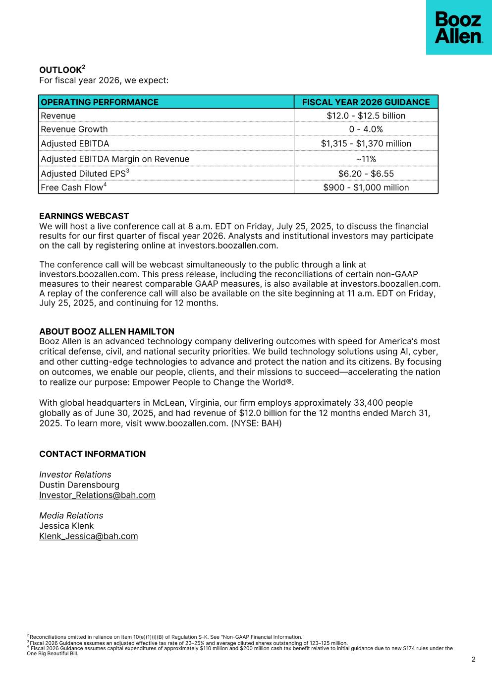 2 Reconciliations omitted in reliance on Item 10(e)(1)(i)(B) of Regulation S-K. See "Non-GAAP Financial Information." 3 Fiscal 2026 Guidance assumes an adjusted effective tax rate of 23–25% and average diluted shares outstanding of 123–125 million. 4 Fiscal 2026 Guidance assumes capital expenditures of approximately $110 million and $200 million cash tax benefit relative to initial guidance due to new S174 rules under the One Big Beautiful Bill. 2 OPERATING PERFORMANCE FISCAL YEAR 2026 GUIDANCE Revenue $12.0 - $12.5 billion Revenue Growth 0 - 4.0% Adjusted EBITDA $1,315 - $1,370 million Adjusted EBITDA Margin on Revenue ~11% Adjusted Diluted EPS3 $6.20 - $6.55 Free Cash Flow4 $900 - $1,000 million EARNINGS WEBCAST We will host a live conference call at 8 a.m. EDT on Friday, July 25, 2025, to discuss the financial results for our first quarter of fiscal year 2026. Analysts and institutional investors may participate on the call by registering online at investors.boozallen.com. The conference call will be webcast simultaneously to the public through a link at investors.boozallen.com. This press release, including the reconciliations of certain non-GAAP measures to their nearest comparable GAAP measures, is also available at investors.boozallen.com. A replay of the conference call will also be available on the site beginning at 11 a.m. EDT on Friday, July 25, 2025, and continuing for 12 months. ABOUT BOOZ ALLEN HAMILTON Booz Allen is an advanced technology company delivering outcomes with speed for America’s most critical defense, civil, and national security priorities. We build technology solutions using AI, cyber, and other cutting-edge technologies to advance and protect the nation and its citizens. By focusing on outcomes, we enable our people, clients, and their missions to succeed—accelerating the nation to realize our purpose: Empower People to Change the World®. With global headquarters in McLean, Virginia, our firm employs approximately 33,400 people globally as of June 30, 2025, and had revenue of $12.0 billion for the 12 months ended March 31, 2025. To learn more, visit www.boozallen.com. (NYSE: BAH) CONTACT INFORMATION Investor Relations Dustin Darensbourg Investor_Relations@bah.com Media Relations Jessica Klenk Klenk_Jessica@bah.com OUTLOOK2 For fiscal year 2026, we expect: