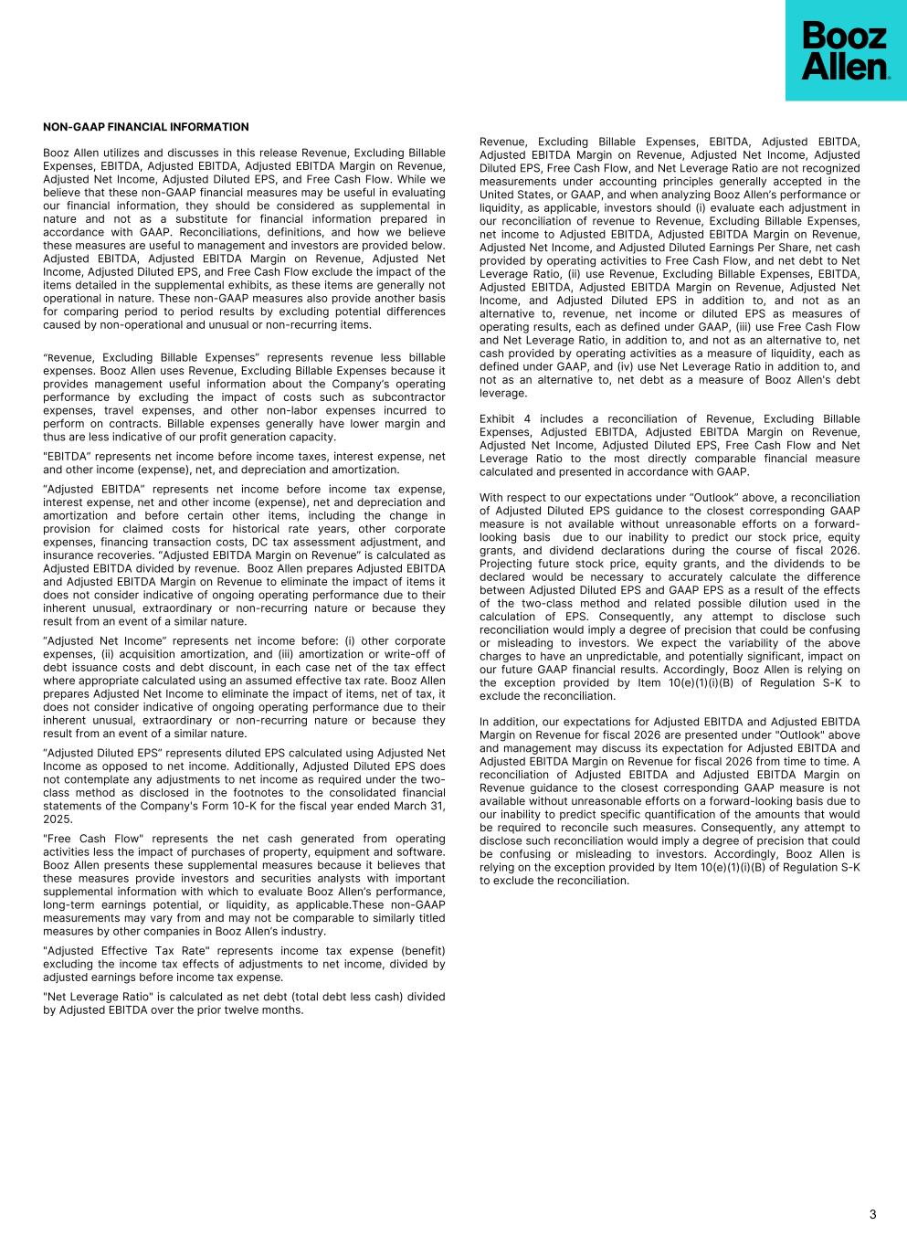 NON-GAAP FINANCIAL INFORMATION Booz Allen utilizes and discusses in this release Revenue, Excluding Billable Expenses, EBITDA, Adjusted EBITDA, Adjusted EBITDA Margin on Revenue, Adjusted Net Income, Adjusted Diluted EPS, and Free Cash Flow. While we believe that these non-GAAP financial measures may be useful in evaluating our financial information, they should be considered as supplemental in nature and not as a substitute for financial information prepared in accordance with GAAP. Reconciliations, definitions, and how we believe these measures are useful to management and investors are provided below. Adjusted EBITDA, Adjusted EBITDA Margin on Revenue, Adjusted Net Income, Adjusted Diluted EPS, and Free Cash Flow exclude the impact of the items detailed in the supplemental exhibits, as these items are generally not operational in nature. These non-GAAP measures also provide another basis for comparing period to period results by excluding potential differences caused by non-operational and unusual or non-recurring items. “Revenue, Excluding Billable Expenses” represents revenue less billable expenses. Booz Allen uses Revenue, Excluding Billable Expenses because it provides management useful information about the Company’s operating performance by excluding the impact of costs such as subcontractor expenses, travel expenses, and other non-labor expenses incurred to perform on contracts. Billable expenses generally have lower margin and thus are less indicative of our profit generation capacity. "EBITDA” represents net income before income taxes, interest expense, net and other income (expense), net, and depreciation and amortization. “Adjusted EBITDA” represents net income before income tax expense, interest expense, net and other income (expense), net and depreciation and amortization and before certain other items, including the change in provision for claimed costs for historical rate years, other corporate expenses, financing transaction costs, DC tax assessment adjustment, and insurance recoveries. “Adjusted EBITDA Margin on Revenue” is calculated as Adjusted EBITDA divided by revenue. Booz Allen prepares Adjusted EBITDA and Adjusted EBITDA Margin on Revenue to eliminate the impact of items it does not consider indicative of ongoing operating performance due to their inherent unusual, extraordinary or non-recurring nature or because they result from an event of a similar nature. “Adjusted Net Income” represents net income before: (i) other corporate expenses, (ii) acquisition amortization, and (iii) amortization or write-off of debt issuance costs and debt discount, in each case net of the tax effect where appropriate calculated using an assumed effective tax rate. Booz Allen prepares Adjusted Net Income to eliminate the impact of items, net of tax, it does not consider indicative of ongoing operating performance due to their inherent unusual, extraordinary or non-recurring nature or because they result from an event of a similar nature. “Adjusted Diluted EPS” represents diluted EPS calculated using Adjusted Net Income as opposed to net income. Additionally, Adjusted Diluted EPS does not contemplate any adjustments to net income as required under the two- class method as disclosed in the footnotes to the consolidated financial statements of the Company's Form 10-K for the fiscal year ended March 31, 2025. "Free Cash Flow" represents the net cash generated from operating activities less the impact of purchases of property, equipment and software. Booz Allen presents these supplemental measures because it believes that these measures provide investors and securities analysts with important supplemental information with which to evaluate Booz Allen’s performance, long-term earnings potential, or liquidity, as applicable.These non-GAAP measurements may vary from and may not be comparable to similarly titled measures by other companies in Booz Allen’s industry. "Adjusted Effective Tax Rate" represents income tax expense (benefit) excluding the income tax effects of adjustments to net income, divided by adjusted earnings before income tax expense. "Net Leverage Ratio" is calculated as net debt (total debt less cash) divided by Adjusted EBITDA over the prior twelve months. Revenue, Excluding Billable Expenses, EBITDA, Adjusted EBITDA, Adjusted EBITDA Margin on Revenue, Adjusted Net Income, Adjusted Diluted EPS, Free Cash Flow, and Net Leverage Ratio are not recognized measurements under accounting principles generally accepted in the United States, or GAAP, and when analyzing Booz Allen’s performance or liquidity, as applicable, investors should (i) evaluate each adjustment in our reconciliation of revenue to Revenue, Excluding Billable Expenses, net income to Adjusted EBITDA, Adjusted EBITDA Margin on Revenue, Adjusted Net Income, and Adjusted Diluted Earnings Per Share, net cash provided by operating activities to Free Cash Flow, and net debt to Net Leverage Ratio, (ii) use Revenue, Excluding Billable Expenses, EBITDA, Adjusted EBITDA, Adjusted EBITDA Margin on Revenue, Adjusted Net Income, and Adjusted Diluted EPS in addition to, and not as an alternative to, revenue, net income or diluted EPS as measures of operating results, each as defined under GAAP, (iii) use Free Cash Flow and Net Leverage Ratio, in addition to, and not as an alternative to, net cash provided by operating activities as a measure of liquidity, each as defined under GAAP, and (iv) use Net Leverage Ratio in addition to, and not as an alternative to, net debt as a measure of Booz Allen's debt leverage. Exhibit 4 includes a reconciliation of Revenue, Excluding Billable Expenses, Adjusted EBITDA, Adjusted EBITDA Margin on Revenue, Adjusted Net Income, Adjusted Diluted EPS, Free Cash Flow and Net Leverage Ratio to the most directly comparable financial measure calculated and presented in accordance with GAAP. With respect to our expectations under “Outlook” above, a reconciliation of A
