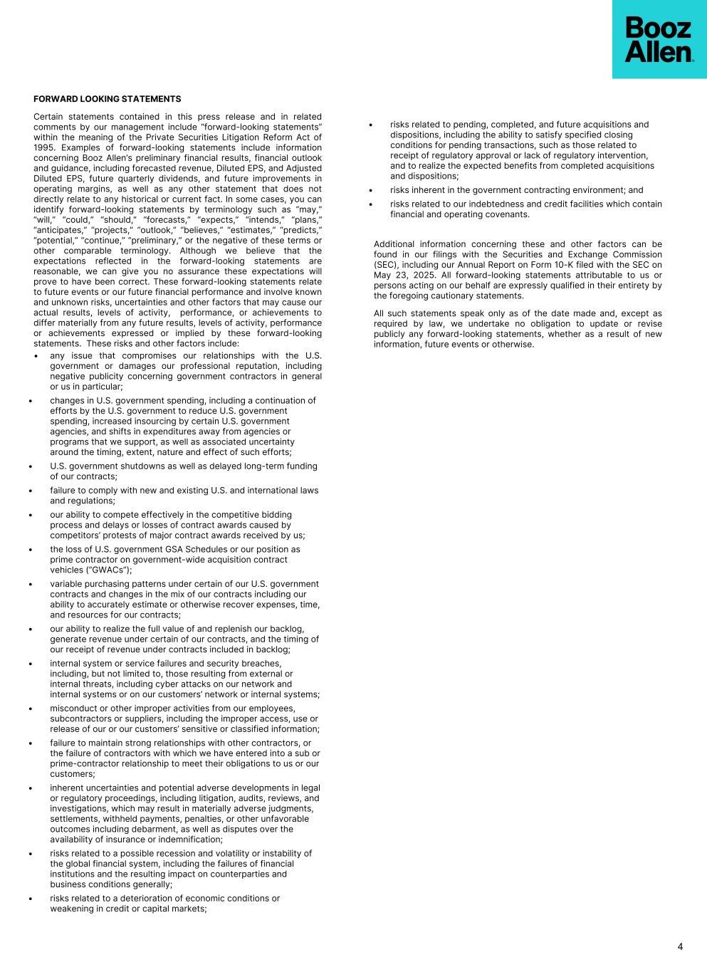 FORWARD LOOKING STATEMENTS Certain statements contained in this press release and in related comments by our management include “forward-looking statements” within the meaning of the Private Securities Litigation Reform Act of 1995. Examples of forward-looking statements include information concerning Booz Allen’s preliminary financial results, financial outlook and guidance, including forecasted revenue, Diluted EPS, and Adjusted Diluted EPS, future quarterly dividends, and future improvements in operating margins, as well as any other statement that does not directly relate to any historical or current fact. In some cases, you can identify forward-looking statements by terminology such as “may,” “will,” “could,” “should,” “forecasts,” “expects,” “intends,” “plans,” “anticipates,” “projects,” “outlook,” “believes,” “estimates,” “predicts,” “potential,” “continue,” “preliminary,” or the negative of these terms or other comparable terminology. Although we believe that the expectations reflected in the forward-looking statements are reasonable, we can give you no assurance these expectations will prove to have been correct. These forward-looking statements relate to future events or our future financial performance and involve known and unknown risks, uncertainties and other factors that may cause our actual results, levels of activity, performance, or achievements to differ materially from any future results, levels of activity, performance or achievements expressed or implied by these forward-looking statements. These risks and other factors include: • any issue that compromises our relationships with the U.S. government or damages our professional reputation, including negative publicity concerning government contractors in general or us in particular; • changes in U.S. government spending, including a continuation of efforts by the U.S. government to reduce U.S. government spending, increased insourcing by certain U.S. government agencies, and shifts in expenditures away from agencies or programs that we support, as well as associated uncertainty around the timing, extent, nature and effect of such efforts; • U.S. government shutdowns as well as delayed long-term funding of our contracts; • failure to comply with new and existing U.S. and international laws and regulations; • our ability to compete effectively in the competitive bidding process and delays or losses of contract awards caused by competitors’ protests of major contract awards received by us; • the loss of U.S. government GSA Schedules or our position as prime contractor on government-wide acquisition contract vehicles (“GWACs”); • variable purchasing patterns under certain of our U.S. government contracts and changes in the mix of our contracts including our ability to accurately estimate or otherwise recover expenses, time, and resources for our contracts; • our ability to realize the full value of and replenish our backlog, generate revenue under certain of our contracts, and the timing of our receipt of revenue under contracts included in backlog; • internal system or service failures and security breaches, including, but not limited to, those resulting from external or internal threats, including cyber attacks on our network and internal systems or on our customers’ network or internal systems; • misconduct or other improper activities from our employees, subcontractors or suppliers, including the improper access, use or release of our or our customers’ sensitive or classified information; • failure to maintain strong relationships with other contractors, or the failure of contractors with which we have entered into a sub or prime-contractor relationship to meet their obligations to us or our customers; • inherent uncertainties and potential adverse developments in legal or regulatory proceedings, including litigation, audits, reviews, and investigations, which may result in materially adverse judgments, settlements, withheld payments, penalties, or other unfavorable outcomes including debarment, as well as disputes over the availability of insurance or indemnification; • risks related to a possible recession and volatility or instability of the global financial system, including the failures of financial institutions and the resulting impact on counterparties and business conditions generally; • risks related to a deterioration of economic conditions or weakening in credit or capital markets; • risks related to pending, completed, and future acquisitions and dispositions, including the ability to satisfy specified closing conditions for pending transactions, such as those related to receipt of regulatory approval or lack of regulatory intervention, and to realize the expected benefits from completed acquisitions and dispositions; • risks inherent in the government contracting environment; and • risks related to our indebtedness and credit facilities which contain financial and operating covenants. Additional information concerning these and other factors can be found in our filings with the Securities and Exchange Commission (SEC), including our Annual Report on Form 10-K filed with the SEC on May 23, 2025. All forward-looking statements attributable to us or persons acting on our behalf are expressly qualified in their entirety by the foregoing cautionary statements. All such statements speak only as of the date made and, except as required by law, we undertake no obligation to update or revise publicly any forward-looking statements, whether as a result of new information, future events or otherwise. 4