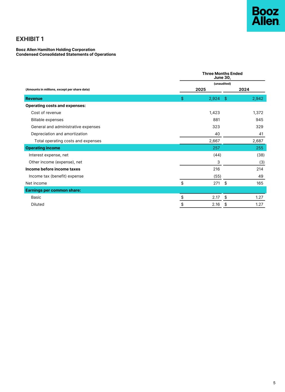 EXHIBIT 1 Booz Allen Hamilton Holding Corporation Condensed Consolidated Statements of Operations 5 Three Months Ended June 30, (unaudited) (Amounts in millions, except per share data) 2025 2024 Revenue $ 2,924 $ 2,942 Operating costs and expenses: Cost of revenue 1,423 1,372 Billable expenses 881 945 General and administrative expenses 323 329 Depreciation and amortization 40 41 Total operating costs and expenses 2,667 2,687 Operating income 257 255 Interest expense, net (44) (38) Other income (expense), net 3 (3) Income before income taxes 216 214 Income tax (benefit) expense (55) 49 Net income $ 271 $ 165 Earnings per common share: Basic $ 2.17 $ 1.27 Diluted $ 2.16 $ 1.27