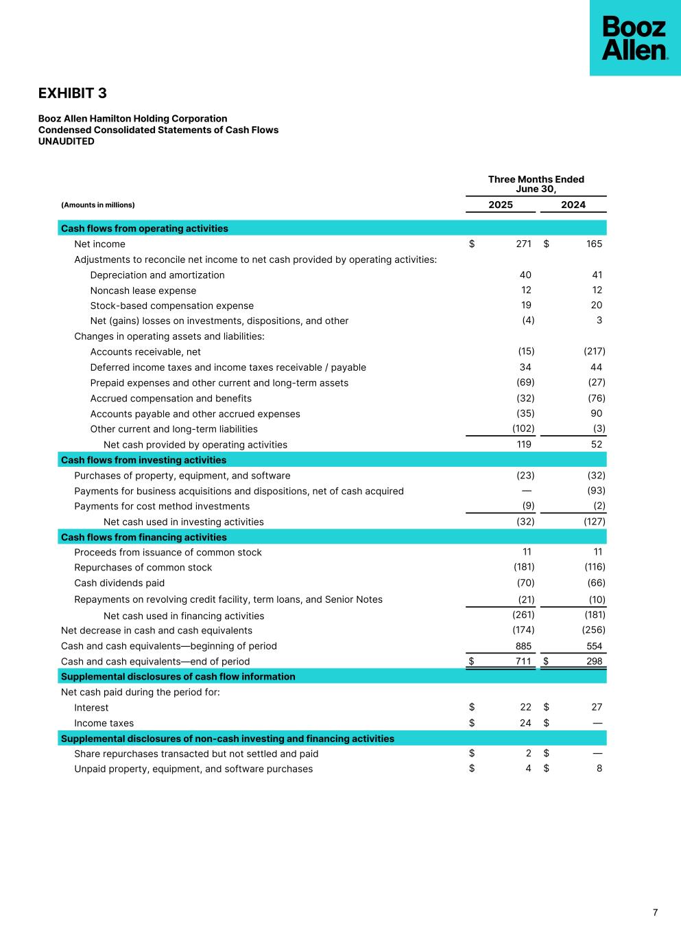 EXHIBIT 3 Booz Allen Hamilton Holding Corporation Condensed Consolidated Statements of Cash Flows UNAUDITED Three Months Ended June 30, (Amounts in millions) 2025 2024 Cash flows from operating activities Net income $ 271 $ 165 Adjustments to reconcile net income to net cash provided by operating activities: Depreciation and amortization 40 41 Noncash lease expense 12 12 Stock-based compensation expense 19 20 Net (gains) losses on investments, dispositions, and other (4) 3 Changes in operating assets and liabilities: Accounts receivable, net (15) (217) Deferred income taxes and income taxes receivable / payable 34 44 Prepaid expenses and other current and long-term assets (69) (27) Accrued compensation and benefits (32) (76) Accounts payable and other accrued expenses (35) 90 Other current and long-term liabilities (102) (3) Net cash provided by operating activities 119 52 Cash flows from investing activities Purchases of property, equipment, and software (23) (32) Payments for business acquisitions and dispositions, net of cash acquired — (93) Payments for cost method investments (9) (2) Net cash used in investing activities (32) (127) Cash flows from financing activities Proceeds from issuance of common stock 11 11 Repurchases of common stock (181) (116) Cash dividends paid (70) (66) Repayments on revolving credit facility, term loans, and Senior Notes (21) (10) Net cash used in financing activities (261) (181) Net decrease in cash and cash equivalents (174) (256) Cash and cash equivalents––beginning of period 885 554 Cash and cash equivalents––end of period $ 711 $ 298 Supplemental disclosures of cash flow information Net cash paid during the period for: Interest $ 22 $ 27 Income taxes $ 24 $ — Supplemental disclosures of non-cash investing and financing activities Share repurchases transacted but not settled and paid $ 2 $ — Unpaid property, equipment, and software purchases $ 4 $ 8 7
