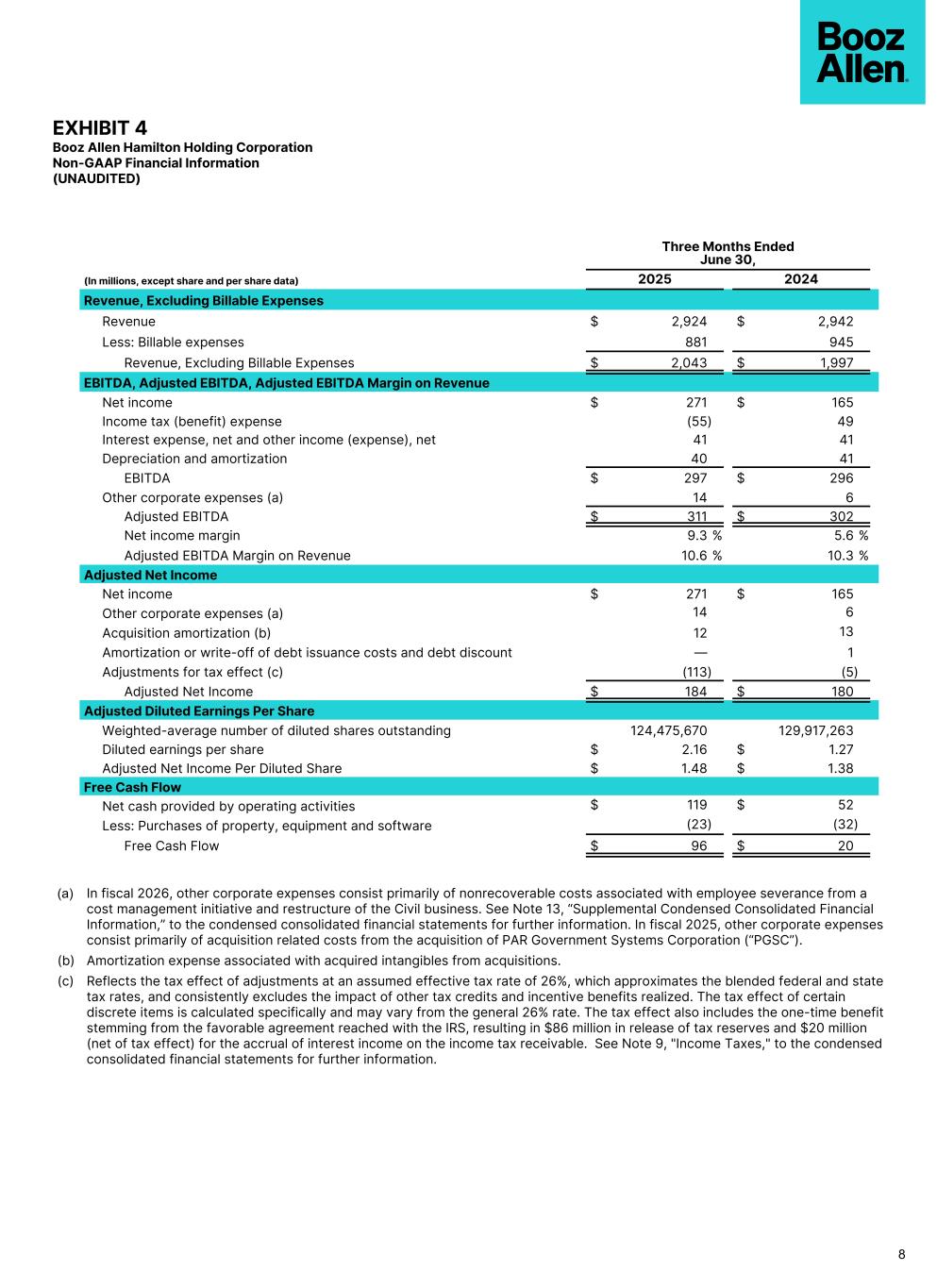 EXHIBIT 4 Booz Allen Hamilton Holding Corporation Non-GAAP Financial Information (UNAUDITED) Three Months Ended June 30, (In millions, except share and per share data) 2025 2024 Revenue, Excluding Billable Expenses Revenue $ 2,924 $ 2,942 Less: Billable expenses 881 945 Revenue, Excluding Billable Expenses $ 2,043 $ 1,997 EBITDA, Adjusted EBITDA, Adjusted EBITDA Margin on Revenue Net income $ 271 $ 165 Income tax (benefit) expense (55) 49 Interest expense, net and other income (expense), net 41 41 Depreciation and amortization 40 41 EBITDA $ 297 $ 296 Other corporate expenses (a) 14 6 Adjusted EBITDA $ 311 $ 302 Net income margin 9.3 % 5.6 % Adjusted EBITDA Margin on Revenue 10.6 % 10.3 % Adjusted Net Income Net income $ 271 $ 165 Other corporate expenses (a) 14 6 Acquisition amortization (b) 12 13 Amortization or write-off of debt issuance costs and debt discount — 1 Adjustments for tax effect (c) (113) (5) Adjusted Net Income $ 184 $ 180 Adjusted Diluted Earnings Per Share Weighted-average number of diluted shares outstanding 124,475,670 129,917,263 Diluted earnings per share $ 2.16 $ 1.27 Adjusted Net Income Per Diluted Share $ 1.48 $ 1.38 Free Cash Flow Net cash provided by operating activities $ 119 $ 52 Less: Purchases of property, equipment and software (23) (32) Free Cash Flow $ 96 $ 20 8 (a) In fiscal 2026, other corporate expenses consist primarily of nonrecoverable costs associated with employee severance from a cost management initiative and restructure of the Civil business. See Note 13, “Supplemental Condensed Consolidated Financial Information,” to the condensed consolidated financial statements for further information. In fiscal 2025, other corporate expenses consist primarily of acquisition related costs from the acquisition of PAR Government Systems Corporation (“PGSC”). (b) Amortization expense associated with acquired intangibles from acquisitions. (c) Reflects the tax effect of adjustments at an assumed effective tax rate of 26%, which approximates the blended federal and state tax rates, and consistently excludes the impact of other tax credits and incentive benefits realized. The tax effect of certain discrete items is calculated specifically and may vary from the general 26% rate. The tax effect also includes the one-time benefit stemming from the favorable agreement reached with the IRS, resulting in $86 million in release of tax reserves and $20 million (net of tax effect) for the accrual of interest income on the income tax receivable. See Note 9, "Income Taxes," to the condensed consolidated financial statements for further information.