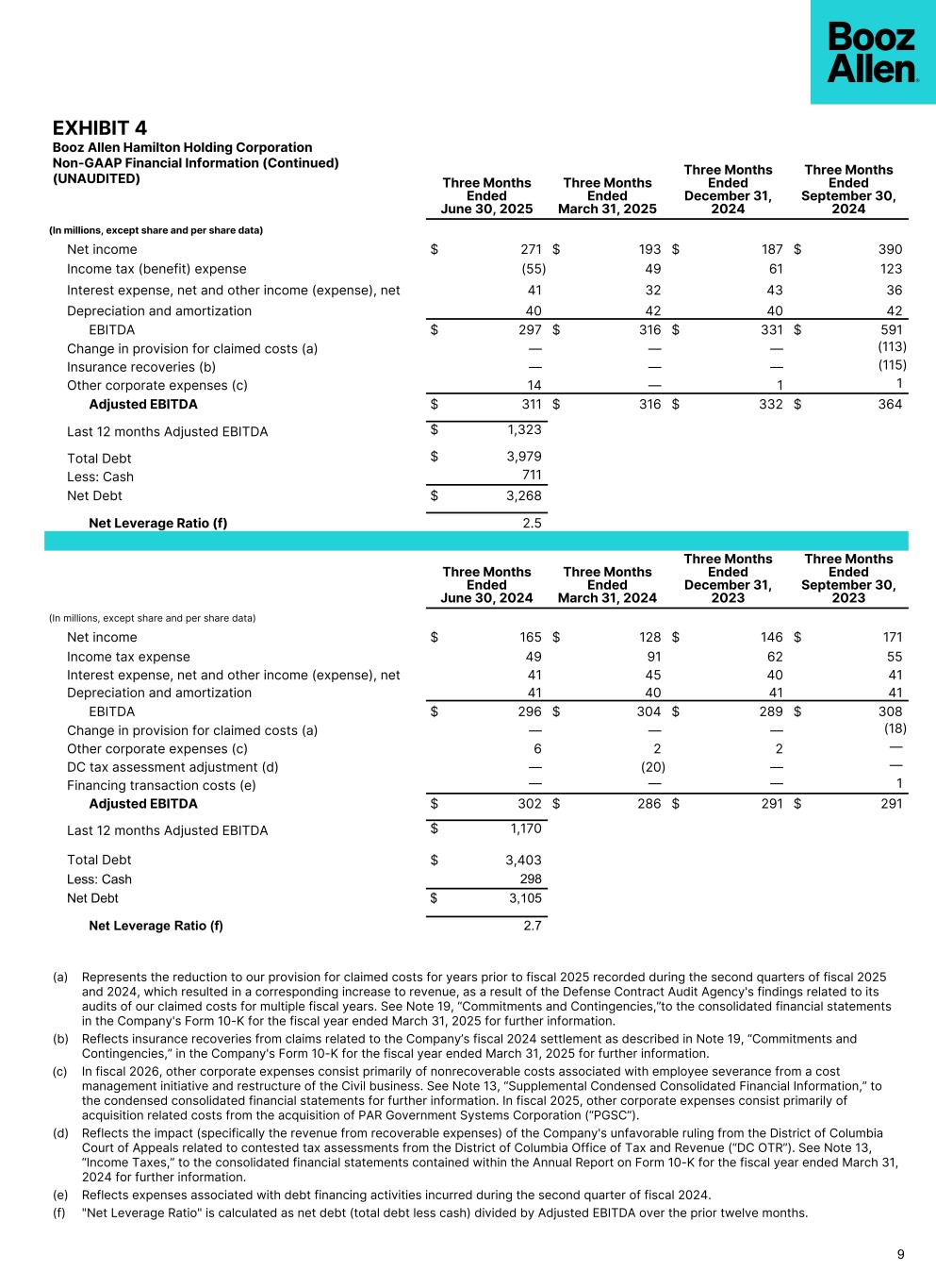 EXHIBIT 4 Booz Allen Hamilton Holding Corporation Non-GAAP Financial Information (Continued) (UNAUDITED) Three Months Ended June 30, 2025 Three Months Ended March 31, 2025 Three Months Ended December 31, 2024 Three Months Ended September 30, 2024 (In millions, except share and per share data) Net income $ 271 $ 193 $ 187 $ 390 Income tax (benefit) expense (55) 49 61 123 Interest expense, net and other income (expense), net 41 32 43 36 Depreciation and amortization 40 42 40 42 EBITDA $ 297 $ 316 $ 331 $ 591 Change in provision for claimed costs (a) — — — (113) Insurance recoveries (b) — — — (115) Other corporate expenses (c) 14 — 1 1 Adjusted EBITDA $ 311 $ 316 $ 332 $ 364 Last 12 months Adjusted EBITDA $ 1,323 Total Debt $ 3,979 Less: Cash 711 Net Debt $ 3,268 Net Leverage Ratio (f) 2.5 Three Months Ended June 30, 2024 Three Months Ended March 31, 2024 Three Months Ended December 31, 2023 Three Months Ended September 30, 2023 (In millions, except share and per share data) Net income $ 165 $ 128 $ 146 $ 171 Income tax expense 49 91 62 55 Interest expense, net and other income (expense), net 41 45 40 41 Depreciation and amortization 41 40 41 41 EBITDA $ 296 $ 304 $ 289 $ 308 Change in provision for claimed costs (a) — — — (18) Other corporate expenses (c) 6 2 2 — DC tax assessment adjustment (d) — (20) — — Financing transaction costs (e) — — — 1 Adjusted EBITDA $ 302 $ 286 $ 291 $ 291 Last 12 months Adjusted EBITDA $ 1,170 Total Debt $ 3,403 Less: Cash 298 Net Debt $ 3,105 Net Leverage Ratio (f) 2.7 9 (a) Represents the reduction to our provision for claimed costs for years prior to fiscal 2025 recorded during the second quarters of fiscal 2025 and 2024, which resulted in a corresponding increase to revenue, as a result of the Defense Contract Audit Agency's findings related to its audits of our claimed costs for multiple fiscal years. See Note 19, “Commitments and Contingencies,”to the consolidated financial statements in the Company's Form 10-K for the fiscal year ended March 31, 2025 for further information. (b) Reflects insurance recoveries from claims related to the Company’s fiscal 2024 settlement as described in Note 19, “Commitments and Contingencies,” in the Company's Form 10-K for the fiscal year ended March 31, 2025 for further information. (c) In fiscal 2026, other corporate expenses consist primarily of nonrecoverable costs associated with employee severance from a cost management initiative and restructure of the Civil business. See Note 13, “Supplemental Condensed Consolidated Financial Information,” to the condensed consolidated financial statements for further information. In fiscal 2025, other corporate expenses consist primarily of acquisition related costs from the acquisition of PAR Government Systems Corporation (“PGSC”). (d) Reflects the impact (specifically the revenue from recoverable expenses) of the Company's unfavorable ruling from the District of Columbia Court of Appeals related to contested tax assessments from the District of Columbia Office of Tax and Revenue (“DC OTR”). See Note 13, “Income Taxes,” to the consolidated financial statements contained within the Annual Report on Form 10-K for the fiscal year ended March 31, 2024 for further information. (e) Reflects expenses associated with debt financing activities incurred during the second quarter of fiscal 2024. (f) "Net Leverage Ratio" is calculated as net debt (total debt less cash) divided by Adjusted EBITDA over the prior twelve months.