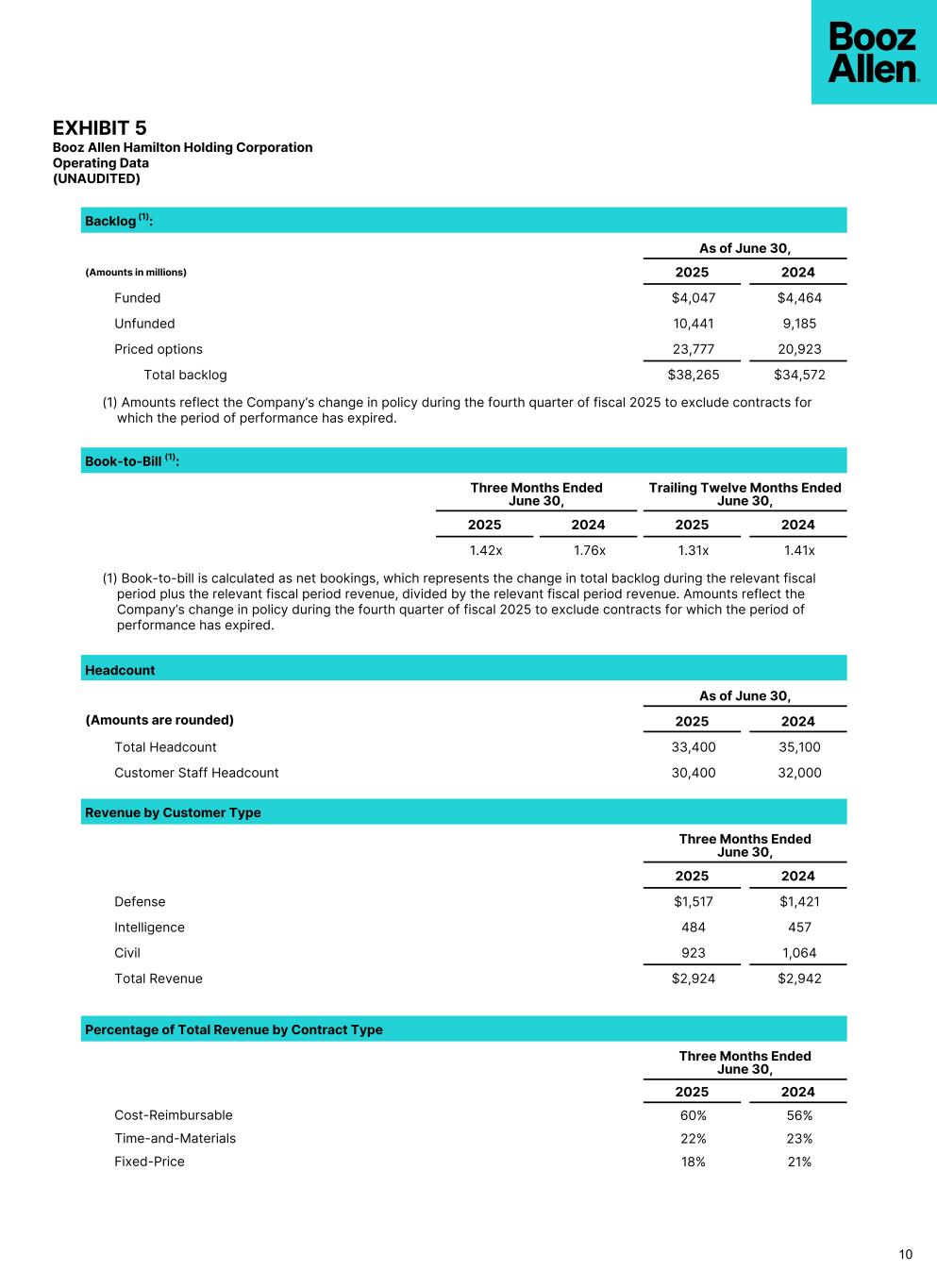 EXHIBIT 5 Booz Allen Hamilton Holding Corporation Operating Data (UNAUDITED)  Backlog (1):   As of June 30, (Amounts in millions) 2025 2024 Funded $4,047 $4,464 Unfunded 10,441 9,185 Priced options 23,777 20,923 Total backlog $38,265 $34,572 (1) Amounts reflect the Company’s change in policy during the fourth quarter of fiscal 2025 to exclude contracts for which the period of performance has expired. Book-to-Bill (1):   Three Months Ended June 30, Trailing Twelve Months Ended June 30,   2025 2024 2025 2024 1.42x 1.76x 1.31x 1.41x (1) Book-to-bill is calculated as net bookings, which represents the change in total backlog during the relevant fiscal period plus the relevant fiscal period revenue, divided by the relevant fiscal period revenue. Amounts reflect the Company’s change in policy during the fourth quarter of fiscal 2025 to exclude contracts for which the period of performance has expired. Headcount   As of June 30, (Amounts are rounded) 2025 2024 Total Headcount 33,400 35,100 Customer Staff Headcount 30,400 32,000 Revenue by Customer Type Three Months Ended June 30, 2025 2024 Defense $1,517 $1,421 Intelligence 484 457 Civil 923 1,064 Total Revenue $2,924 $2,942 Percentage of Total Revenue by Contract Type   Three Months Ended June 30,   2025 2024 Cost-Reimbursable 60% 56% Time-and-Materials 22% 23% Fixed-Price 18% 21% 10