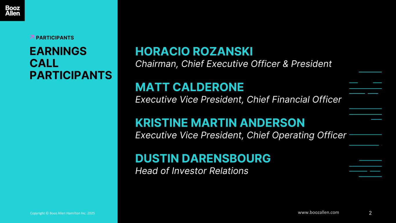 2Copyright © Booz Allen Hamilton Inc. 2025 www.boozallen.com PARTICIPANTS EARNINGS CALL PARTICIPANTS HORACIO ROZANSKI Chairman, Chief Executive Officer & President MATT CALDERONE Executive Vice President, Chief Financial Officer KRISTINE MARTIN ANDERSON Executive Vice President, Chief Operating Officer DUSTIN DARENSBOURG Head of Investor Relations