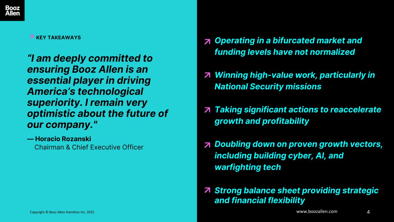 3Copyright © Booz Allen Hamilton Inc. 2025 www.boozallen.com Booz Allen Hamilton Restricted Disclaimer DISCLAIMER Forward Looking Safe Harbor Statement Certain statements contained in this presentation and in related comments by our management include “forward-looking statements” within the meaning of the Private Securities Litigation Reform Act of 1995. Examples of forward- looking statements include information concerning Booz Allen’s preliminary financial results, financial outlook and guidance, including forecasted revenue, Adjusted EBITDA, Diluted EPS, Adjusted Diluted EPS, future quarterly dividends, and future improvements in operating margins, as well as any other statement that does not directly relate to any historical or current fact. In some cases, you can identify forward-looking statements by terminology such as “may,” “will,” “could,” “should,” “forecasts,” “expects,” “intends,” “plans,” “anticipates,” “projects,” “outlook,” “believes,” “estimates,” “predicts,” “potential,” “continue,” “preliminary,” or the negative of these terms or other comparable terminology. Although we believe that the expectations reflected in the forward-looking statements are reasonable, we can give you no assurance these expectations will prove to have been correct. These forward-looking statements relate to future events or our future financial performance and involve known and unknown risks, uncertainties and other factors that may cause our actual results, levels of activity, performance or achievements to differ materially from any future results, levels of activity, performance or achievements expressed or implied by these forward-looking statements. A number of important factors could cause actual results to differ materially from those contained in or implied by these forward-looking statements, including those factors discussed in our filings with the Securities and Exchange Commission (SEC), including our Annual Report on Form 10-K for the fiscal year ended March 31, 2025, which can be found at the SEC’s website at www.sec.gov. All forward-looking statements attributable to us or persons acting on our behalf are expressly qualified in their entirety by the foregoing cautionary statements. All such statements speak only as of the date made and, except as required by law, we undertake no obligation to update or revise publicly any forward-looking statements, whether as a result of new information, future events or otherwise. Booz Allen’s fiscal year ends on March 31 and unless otherwise noted, references to fiscal year, fiscal or FY are for fiscal years ended March 31. Note Regarding Non-GAAP Financial Data Information Booz Allen discloses Revenue, Excluding Billable Expenses, Adjusted EBITDA, Adjusted EBITDA Margin on Revenue, Adjusted Net Income, Adjusted Diluted EPS, Free Cash Flow, and Net Leverage Ratio, which are not recognized measurements under accounting principles generally accepted in the United States, or GAAP, and when analyzing Booz Allen’s performance or liquidity as applicable, investors should (i) evaluate each adjustment in our reconciliation of revenue to Revenue, Excluding Billable Expenses, net income attributable to common stockholders to Adjusted EBITDA, Adjusted EBITDA Margin on Revenue, Adjusted Net Income and Adjusted Diluted EPS, net cash used in operating activities to Free Cash Flow, and net debt to Net Leverage Ratio, and the explanatory footnotes regarding those adjustments, each as defined under GAAP, (ii) use Revenue, Excluding Billable Expenses, Adjusted EBITDA, Adjusted EBITDA Margin on Revenue, Adjusted Net Income, and Adjusted Diluted EPS in addition to, and not as an alternative to, revenue, operating income, net income attributable to common stockholders or diluted EPS as measures of operating results, each as defined under GAAP, (iii) use Free Cash Flow in addition to, and not as an alternative to, net cash used in operating activities as a measure of liquidity, each as defined under GAAP, and (iv) use Net Leverage Ratio in addition to, and not as an alternative to, net debt as a measure of Booz Allen's debt leverage. The Appendix includes a reconciliation of Revenue, Excluding Billable Expenses, Adjusted EBITDA, Adjusted EBITDA Margin on Revenue, Adjusted Net Income, Adjusted Diluted EPS, Free Cash Flow and Net Leverage Ratio to the most directly comparable financial measure calculated and presented in accordance with GAAP. Booz Allen presents these supplemental performance measures because it believes that these measures provide investors and securities analysts with important supplemental information with which to evaluate Booz Allen’s performance, long term earnings potential, or liquidity, as applicable, and to enable them to assess Booz Allen’s performance on the same basis as management. These supplemental performance and liquidity measurements may vary from and may not be comparable to similarly titled measures by other companies in Booz Allen’s industry.   With respect to our expectations under “Financial Outlook", reconciliation of Adjusted Diluted EPS guidance, Adjusted EBITDA, and Adjusted EBITDA Margin on Revenue, and Adjusted Effective Tax Rate to the closest corresponding GAAP measure is not available without unreasonable efforts on a forward-looking basis due to our inability to predict our stock price, equity grants and dividend declarations with respect to Adjusted Diluted EPS, and our net income, net interest and other expenses with respect to Adjusted EBITDA, Adjusted EBITDA Margin on Revenue, and Adjusted Effective Tax Rate, during the course of fiscal 2026. With respect to Adjusted Diluted EPS guidance, projecting future stock price, equity grants and dividends to be declared would be necessary to accurately calculate the difference between Adjusted Diluted EPS and GAAP EPS as a result of the effects of the two-class method and related poss