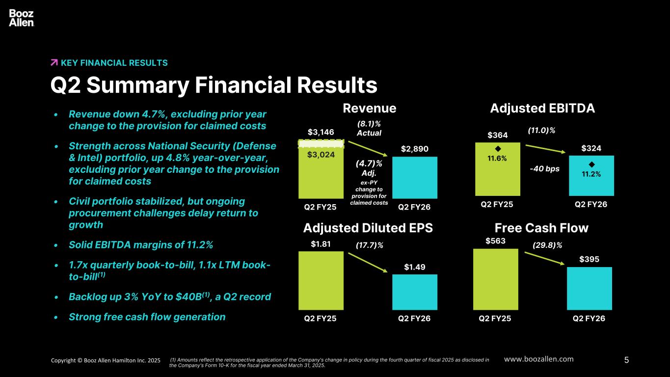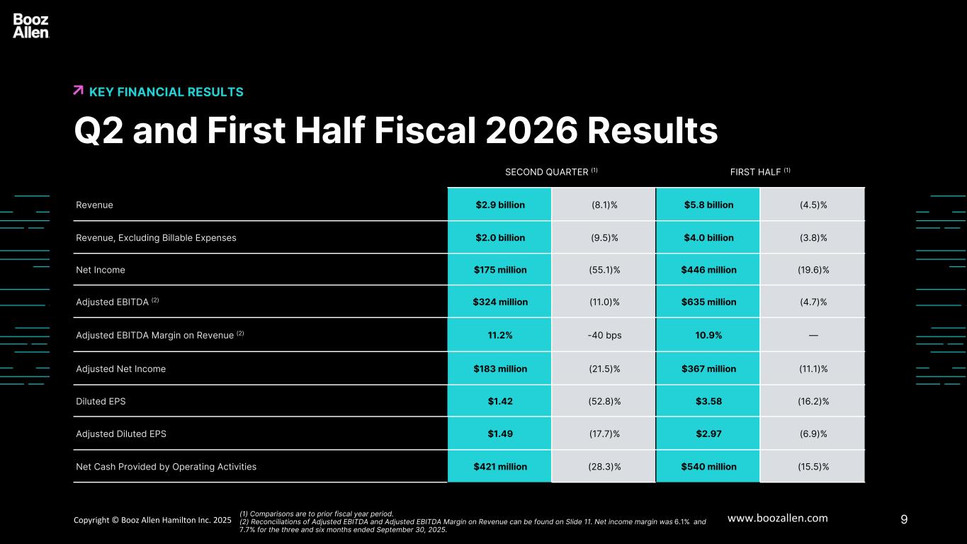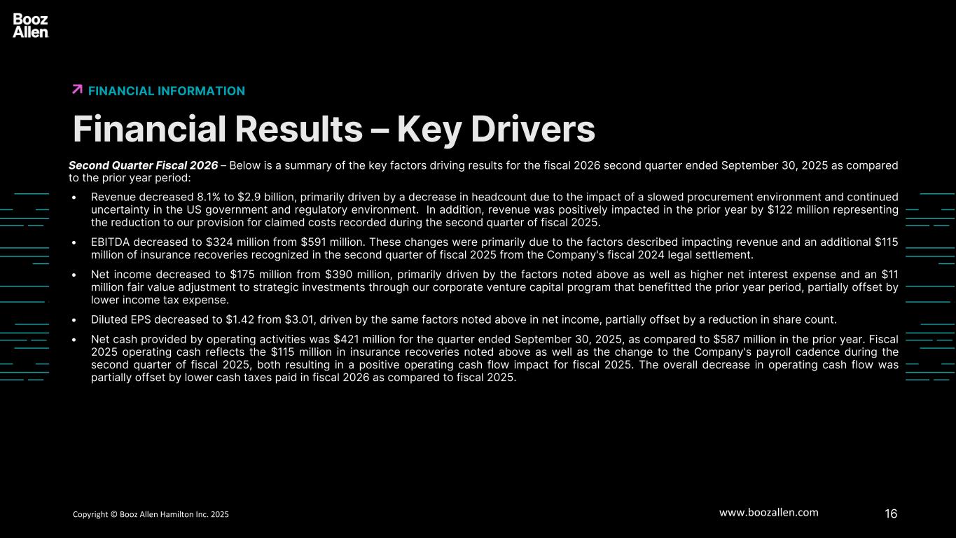 16Copyright © Booz Allen Hamilton Inc. 2025 www.boozallen.com Booz Allen Hamilton Restricted Financial Results – Key Drivers FINANCIAL INFORMATION Second Quarter Fiscal 2026 – Below is a summary of the key factors driving results for the fiscal 2026 second quarter ended September 30, 2025 as compared to the prior year period: • Revenue decreased 8.1% to $2.9 billion, primarily driven by a decrease in headcount due to the impact of a slowed procurement environment and continued uncertainty in the US government and regulatory environment. In addition, revenue was positively impacted in the prior year by $122 million representing the reduction to our provision for claimed costs recorded during the second quarter of fiscal 2025. • EBITDA decreased to $324 million from $591 million. These changes were primarily due to the factors described impacting revenue and an additional $115 million of insurance recoveries recognized in the second quarter of fiscal 2025 from the Company's fiscal 2024 legal settlement. • Net income decreased to $175 million from $390 million, primarily driven by the factors noted above as well as higher net interest expense and an $11 million fair value adjustment to strategic investments through our corporate venture capital program that benefitted the prior year period, partially offset by lower income tax expense. • Diluted EPS decreased to $1.42 from $3.01, driven by the same factors noted above in net income, partially offset by a reduction in share count. • Net cash provided by operating activities was $421 million for the quarter ended September 30, 2025, as compared to $587 million in the prior year. Fiscal 2025 operating cash reflects the $115 million in insurance recoveries noted above as well as the change to the Company's payroll cadence during the second quarter of fiscal 2025, both resulting in a positive operating cash flow impact for fiscal 2025. The overall decrease in operating cash flow was partially offset by lower cash taxes paid in fiscal 2026 as compared to fiscal 2025.