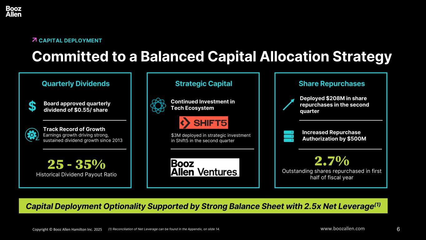 6Copyright © Booz Allen Hamilton Inc. 2025 www.boozallen.com Committed to a Balanced Capital Allocation Strategy CAPITAL DEPLOYMENT Quarterly Dividends Strategic Transaction s Share Repurchase s Capital Deployment Optionality Supported by Strong Balance Sheet with 2.5x Net Leverage(1) Continued Investment in Tech Ecosystem Strategic Capital Share RepurchasesQuarterly Dividends 25 - 35% Historical Dividend Payout Ratio Track Record of Growth Earnings growth driving strong, sustained dividend growth since 2013 Deployed $208M in share repurchases in the second quarter Increased Repurchase Authorization by $500M 2.7% Outstanding shares repurchased in first half of fiscal year Board approved quarterly dividend of $0.55/ share (1) Reconciliation of Net Leverage can be found in the Appendix, on slide 14. $ $3M deployed in strategic investment in Shift5 in the second quarter