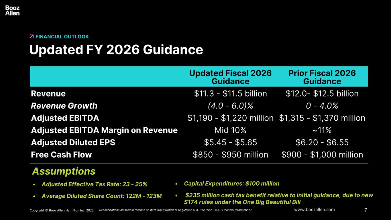 7Copyright © Booz Allen Hamilton Inc. 2025 www.boozallen.com FINANCIAL OUTLOOK Updated FY 2026 Guidance Assumptions • Adjusted Effective Tax Rate: 23 - 25% • Average Diluted Share Count: 122M - 123M Reconciliations omitted in reliance on Item 10(e)(1)(i)(B) of Regulation S-K. See "Non-GAAP Financial Information." Updated Fiscal 2026 Guidance Prior Fiscal 2026 Guidance Revenue $11.3 - $11.5 billion $12.0- $12.5 billion Revenue Growth (4.0 - 6.0)% 0 - 4.0% Adjusted EBITDA $1,190 - $1,220 million $1,315 - $1,370 million Adjusted EBITDA Margin on Revenue Mid 10% ~11% Adjusted Diluted EPS $5.45 - $5.65 $6.20 - $6.55 Free Cash Flow $850 - $950 million $900 - $1,000 million • Capital Expenditures: $100 million • $235 million cash tax benefit relative to initial guidance, due to new S174 rules under the One Big Beautiful Bill
