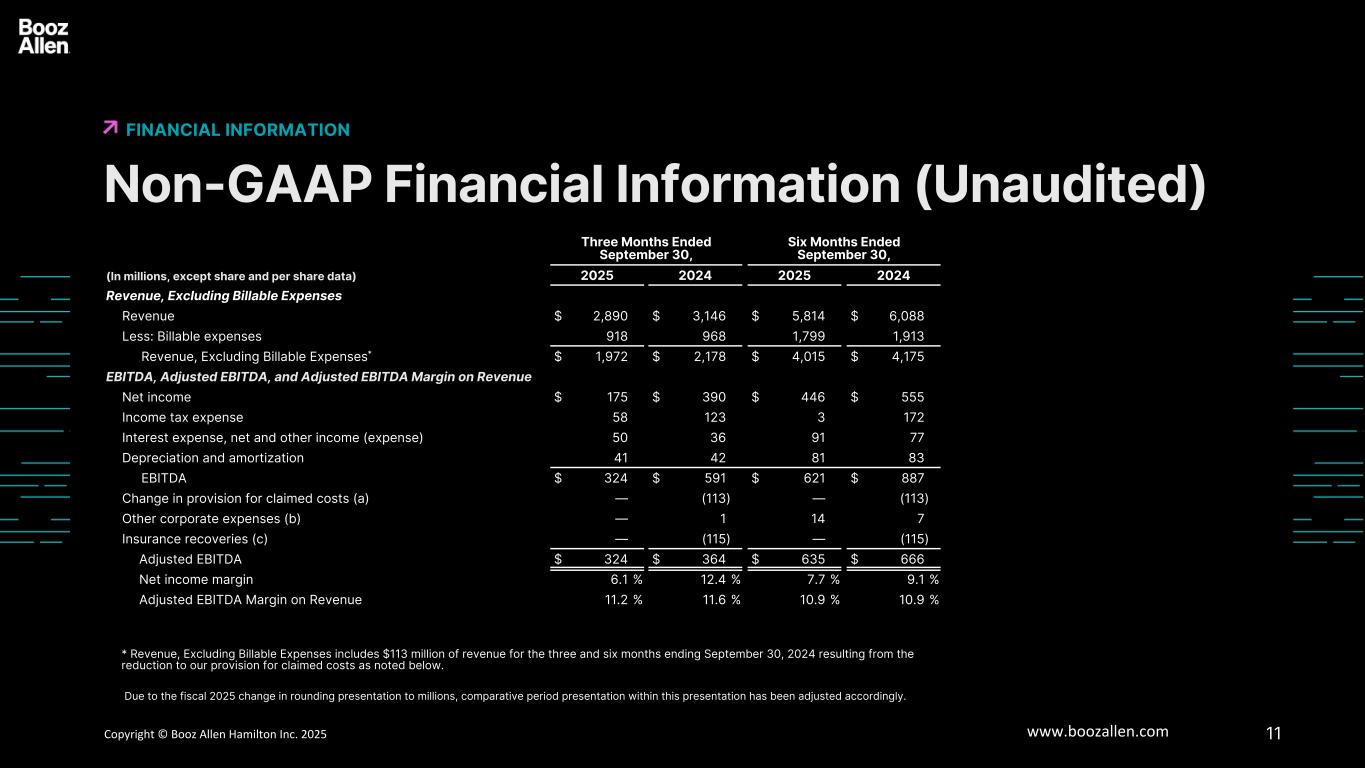 11Copyright © Booz Allen Hamilton Inc. 2025 www.boozallen.com Booz Allen Hamilton Restricted Non-GAAP Financial Information (Unaudited) FINANCIAL INFORMATION   Three Months Ended September 30, Six Months Ended September 30, (In millions, except share and per share data) 2025 2024 2025 2024 Revenue, Excluding Billable Expenses Revenue $ 2,890 $ 3,146 $ 5,814 $ 6,088 Less: Billable expenses 918 968 1,799 1,913 Revenue, Excluding Billable Expenses* $ 1,972 $ 2,178 $ 4,015 $ 4,175 EBITDA, Adjusted EBITDA, and Adjusted EBITDA Margin on Revenue Net income $ 175 $ 390 $ 446 $ 555 Income tax expense 58 123 3 172 Interest expense, net and other income (expense) 50 36 91 77 Depreciation and amortization 41 42 81 83 EBITDA $ 324 $ 591 $ 621 $ 887 Change in provision for claimed costs (a) — (113) — (113) Other corporate expenses (b) — 1 14 7 Insurance recoveries (c) — (115) — (115) Adjusted EBITDA $ 324 $ 364 $ 635 $ 666 Net income margin 6.1 % 12.4 % 7.7 % 9.1 % Adjusted EBITDA Margin on Revenue 11.2 % 11.6 % 10.9 % 10.9 % * Revenue, Excluding Billable Expenses includes $113 million of revenue for the three and six months ending September 30, 2024 resulting from the reduction to our provision for claimed costs as noted below. Due to the fiscal 2025 change in rounding presentation to millions, comparative period presentation within this presentation has been adjusted accordingly.
