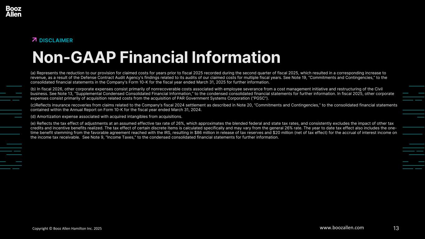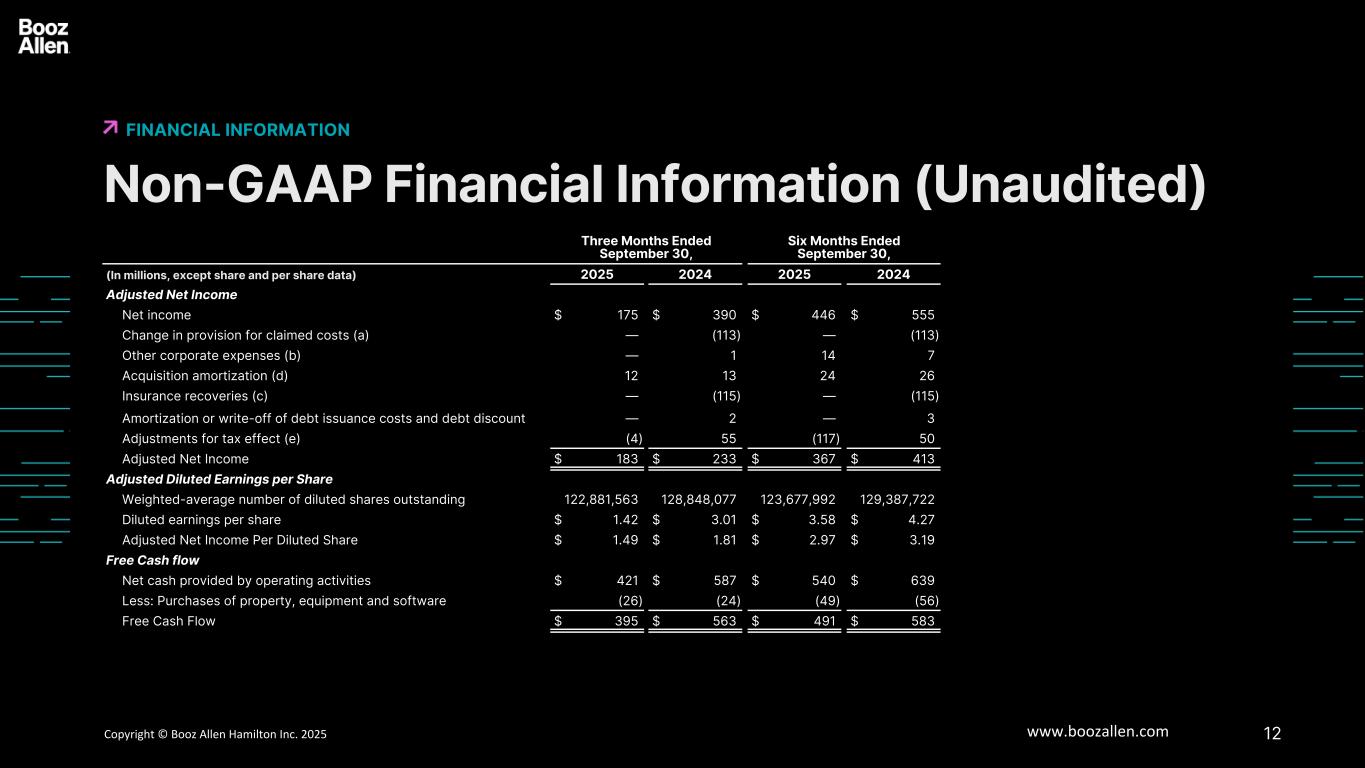 12Copyright © Booz Allen Hamilton Inc. 2025 www.boozallen.com Booz Allen Hamilton Restricted Non-GAAP Financial Information (Unaudited) FINANCIAL INFORMATION   Three Months Ended September 30, Six Months Ended September 30, (In millions, except share and per share data) 2025 2024 2025 2024 Adjusted Net Income Net income $ 175 $ 390 $ 446 $ 555 Change in provision for claimed costs (a) — (113) — (113) Other corporate expenses (b) — 1 14 7 Acquisition amortization (d) 12 13 24 26 Insurance recoveries (c) — (115) — (115) Amortization or write-off of debt issuance costs and debt discount — 2 — 3 Adjustments for tax effect (e) (4) 55 (117) 50 Adjusted Net Income $ 183 $ 233 $ 367 $ 413 Adjusted Diluted Earnings per Share Weighted-average number of diluted shares outstanding 122,881,563 128,848,077 123,677,992 129,387,722 Diluted earnings per share $ 1.42 $ 3.01 $ 3.58 $ 4.27 Adjusted Net Income Per Diluted Share $ 1.49 $ 1.81 $ 2.97 $ 3.19 Free Cash flow Net cash provided by operating activities $ 421 $ 587 $ 540 $ 639 Less: Purchases of property, equipment and software (26) (24) (49) (56) Free Cash Flow $ 395 $ 563 $ 491 $ 583