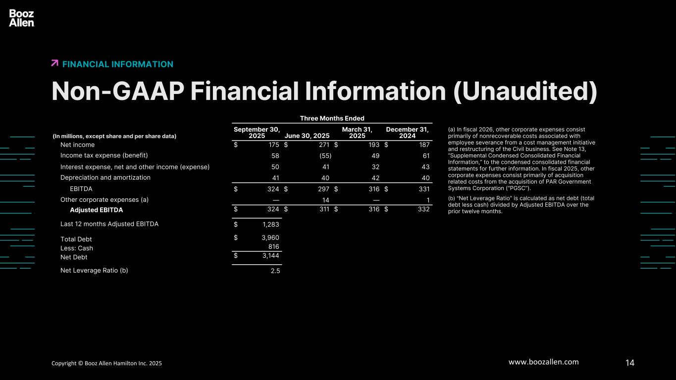 13Copyright © Booz Allen Hamilton Inc. 2025 www.boozallen.com Booz Allen Hamilton Restricted Non-GAAP Financial Information DISCLAIMER (a) Represents the reduction to our provision for claimed costs for years prior to fiscal 2025 recorded during the second quarter of fiscal 2025, which resulted in a corresponding increase to revenue, as a result of the Defense Contract Audit Agency's findings related to its audits of our claimed costs for multiple fiscal years. See Note 19, “Commitments and Contingencies,” to the consolidated financial statements in the Company's Form 10-K for the fiscal year ended March 31, 2025 for further information. (b) In fiscal 2026, other corporate expenses consist primarily of nonrecoverable costs associated with employee severance from a cost management initiative and restructuring of the Civil business. See Note 13, “Supplemental Condensed Consolidated Financial Information,” to the condensed consolidated financial statements for further information. In fiscal 2025, other corporate expenses consist primarily of acquisition related costs from the acquisition of PAR Government Systems Corporation (“PGSC”). (c)Reflects insurance recoveries from claims related to the Company’s fiscal 2024 settlement as described in Note 20, “Commitments and Contingencies,” to the consolidated financial statements contained within the Annual Report on Form 10-K for the fiscal year ended March 31, 2024. (d) Amortization expense associated with acquired intangibles from acquisitions. (e) Reflects the tax effect of adjustments at an assumed effective tax rate of 26%, which approximates the blended federal and state tax rates, and consistently excludes the impact of other tax credits and incentive benefits realized. The tax effect of certain discrete items is calculated specifically and may vary from the general 26% rate. The year to date tax effect also includes the one- time benefit stemming from the favorable agreement reached with the IRS, resulting in $86 million in release of tax reserves and $20 million (net of tax effect) for the accrual of interest income on the income tax receivable. See Note 9, "Income Taxes," to the condensed consolidated financial statements for further information.