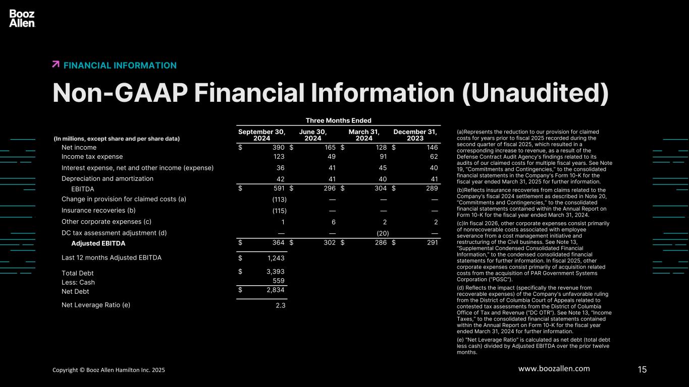 14Copyright © Booz Allen Hamilton Inc. 2025 www.boozallen.com Booz Allen Hamilton Restricted Non-GAAP Financial Information (Unaudited) FINANCIAL INFORMATION (a) In fiscal 2026, other corporate expenses consist primarily of nonrecoverable costs associated with employee severance from a cost management initiative and restructuring of the Civil business. See Note 13, “Supplemental Condensed Consolidated Financial Information,” to the condensed consolidated financial statements for further information. In fiscal 2025, other corporate expenses consist primarily of acquisition related costs from the acquisition of PAR Government Systems Corporation (“PGSC”). (b) "Net Leverage Ratio" is calculated as net debt (total debt less cash) divided by Adjusted EBITDA over the prior twelve months. Three Months Ended (In millions, except share and per share data) September 30, 2025 June 30, 2025 March 31, 2025 December 31, 2024 Net income $ 175 $ 271 $ 193 $ 187 Income tax expense (benefit) 58 (55) 49 61 Interest expense, net and other income (expense) 50 41 32 43 Depreciation and amortization 41 40 42 40 EBITDA $ 324 $ 297 $ 316 $ 331 Other corporate expenses (a) — 14 — 1 Adjusted EBITDA $ 324 $ 311 $ 316 $ 332 Last 12 months Adjusted EBITDA $ 1,283 Total Debt $ 3,960 Less: Cash 816 Net Debt $ 3,144 Net Leverage Ratio (b) 2.5