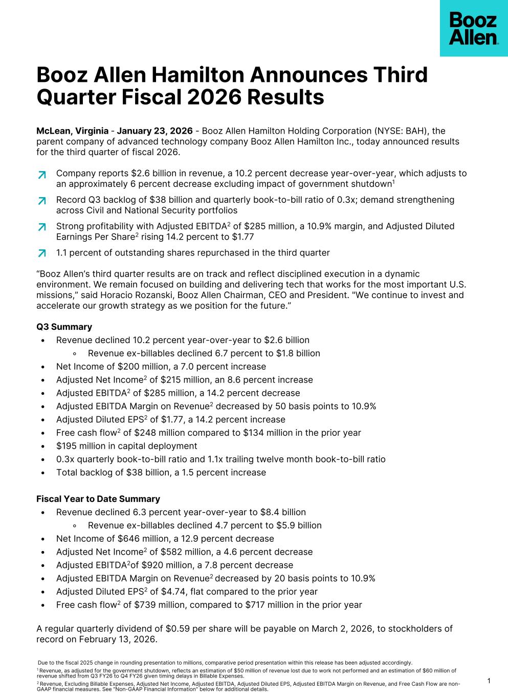 Booz Allen Hamilton Announces Third Quarter Fiscal 2026 Results McLean, Virginia - January 23, 2026 - Booz Allen Hamilton Holding Corporation (NYSE: BAH), the parent company of advanced technology company Booz Allen Hamilton Inc., today announced results for the third quarter of fiscal 2026. Company reports $2.6 billion in revenue, a 10.2 percent decrease year-over-year, which adjusts to an approximately 6 percent decrease excluding impact of government shutdown1 Record Q3 backlog of $38 billion and quarterly book-to-bill ratio of 0.3x; demand strengthening across Civil and National Security portfolios Strong profitability with Adjusted EBITDA2 of $285 million, a 10.9% margin, and Adjusted Diluted Earnings Per Share2 rising 14.2 percent to $1.77 1.1 percent of outstanding shares repurchased in the third quarter “Booz Allen’s third quarter results are on track and reflect disciplined execution in a dynamic environment. We remain focused on building and delivering tech that works for the most important U.S. missions,” said Horacio Rozanski, Booz Allen Chairman, CEO and President. "We continue to invest and accelerate our growth strategy as we position for the future.” Q3 Summary • Revenue declined 10.2 percent year-over-year to $2.6 billion ◦ Revenue ex-billables declined 6.7 percent to $1.8 billion • Net Income of $200 million, a 7.0 percent increase • Adjusted Net Income2 of $215 million, an 8.6 percent increase • Adjusted EBITDA2 of $285 million, a 14.2 percent decrease • Adjusted EBITDA Margin on Revenue2 decreased by 50 basis points to 10.9% • Adjusted Diluted EPS2 of $1.77, a 14.2 percent increase • Free cash flow2 of $248 million compared to $134 million in the prior year • $195 million in capital deployment • 0.3x quarterly book-to-bill ratio and 1.1x trailing twelve month book-to-bill ratio • Total backlog of $38 billion, a 1.5 percent increase Fiscal Year to Date Summary • Revenue declined 6.3 percent year-over-year to $8.4 billion ◦ Revenue ex-billables declined 4.7 percent to $5.9 billion • Net Income of $646 million, a 12.9 percent decrease • Adjusted Net Income2 of $582 million, a 4.6 percent decrease • Adjusted EBITDA2of $920 million, a 7.8 percent decrease • Adjusted EBITDA Margin on Revenue2 decreased by 20 basis points to 10.9% • Adjusted Diluted EPS2 of $4.74, flat compared to the prior year • Free cash flow2 of $739 million, compared to $717 million in the prior year A regular quarterly dividend of $0.59 per share will be payable on March 2, 2026, to stockholders of record on February 13, 2026. 1 Due to the fiscal 2025 change in rounding presentation to millions, comparative period presentation within this release has been adjusted accordingly. 1 Revenue, as adjusted for the government shutdown, reflects an estimation of $50 million of revenue lost due to work not performed and an estimation of $60 million of revenue shifted from Q3 FY26 to Q4 FY26 given timing delays in Billable Expenses. 2 Revenue, Excluding Billable Expenses, Adjusted Net Income, Adjusted EBITDA, Adjusted Diluted EPS, Adjusted EBITDA Margin on Revenue, and Free Cash Flow are non- GAAP financial measures. See "Non-GAAP Financial Information" below for additional details.