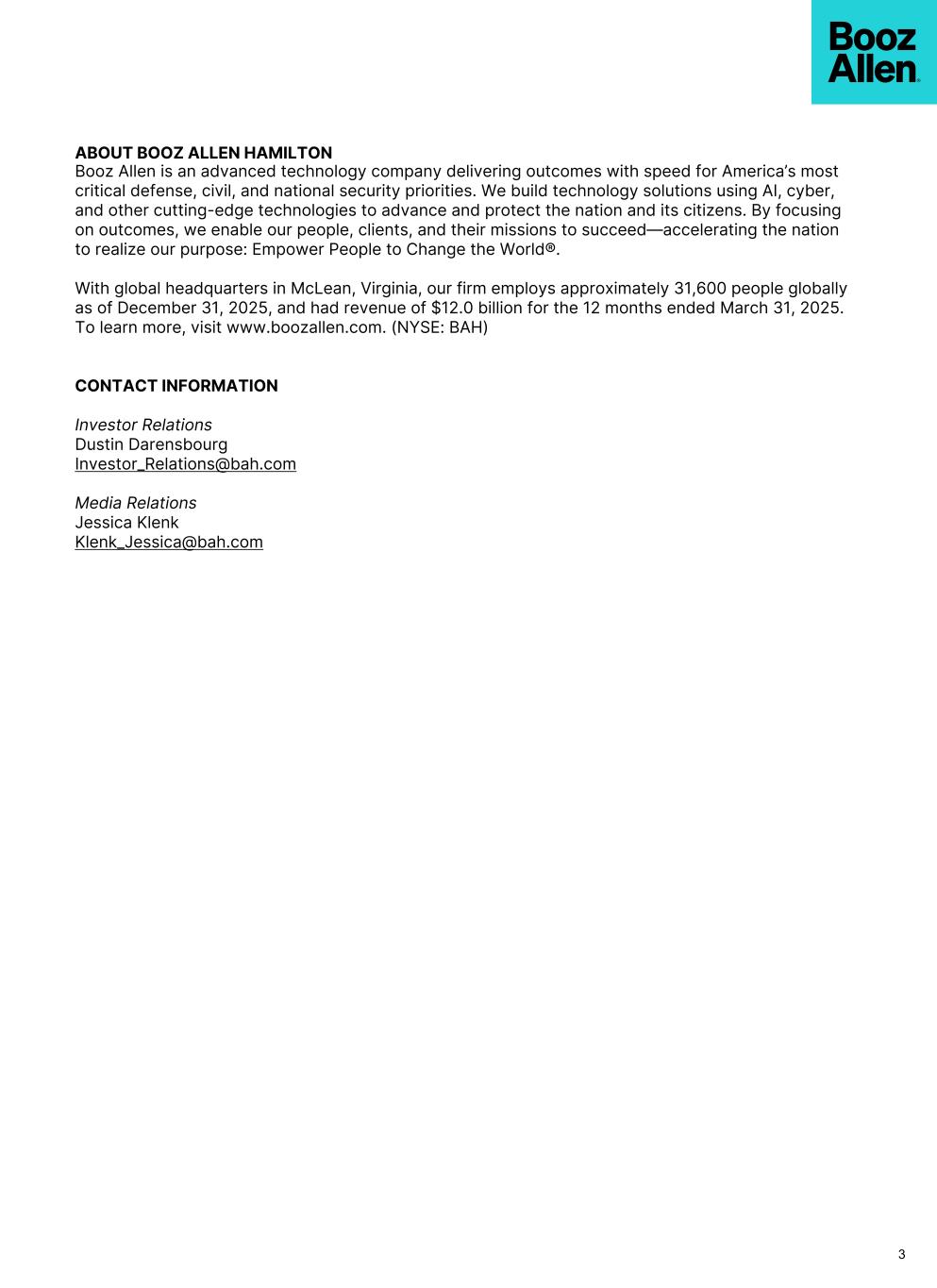 3 ABOUT BOOZ ALLEN HAMILTON Booz Allen is an advanced technology company delivering outcomes with speed for America’s most critical defense, civil, and national security priorities. We build technology solutions using AI, cyber, and other cutting-edge technologies to advance and protect the nation and its citizens. By focusing on outcomes, we enable our people, clients, and their missions to succeed—accelerating the nation to realize our purpose: Empower People to Change the World®. With global headquarters in McLean, Virginia, our firm employs approximately 31,600 people globally as of December 31, 2025, and had revenue of $12.0 billion for the 12 months ended March 31, 2025. To learn more, visit www.boozallen.com. (NYSE: BAH) CONTACT INFORMATION Investor Relations Dustin Darensbourg Investor_Relations@bah.com Media Relations Jessica Klenk Klenk_Jessica@bah.com