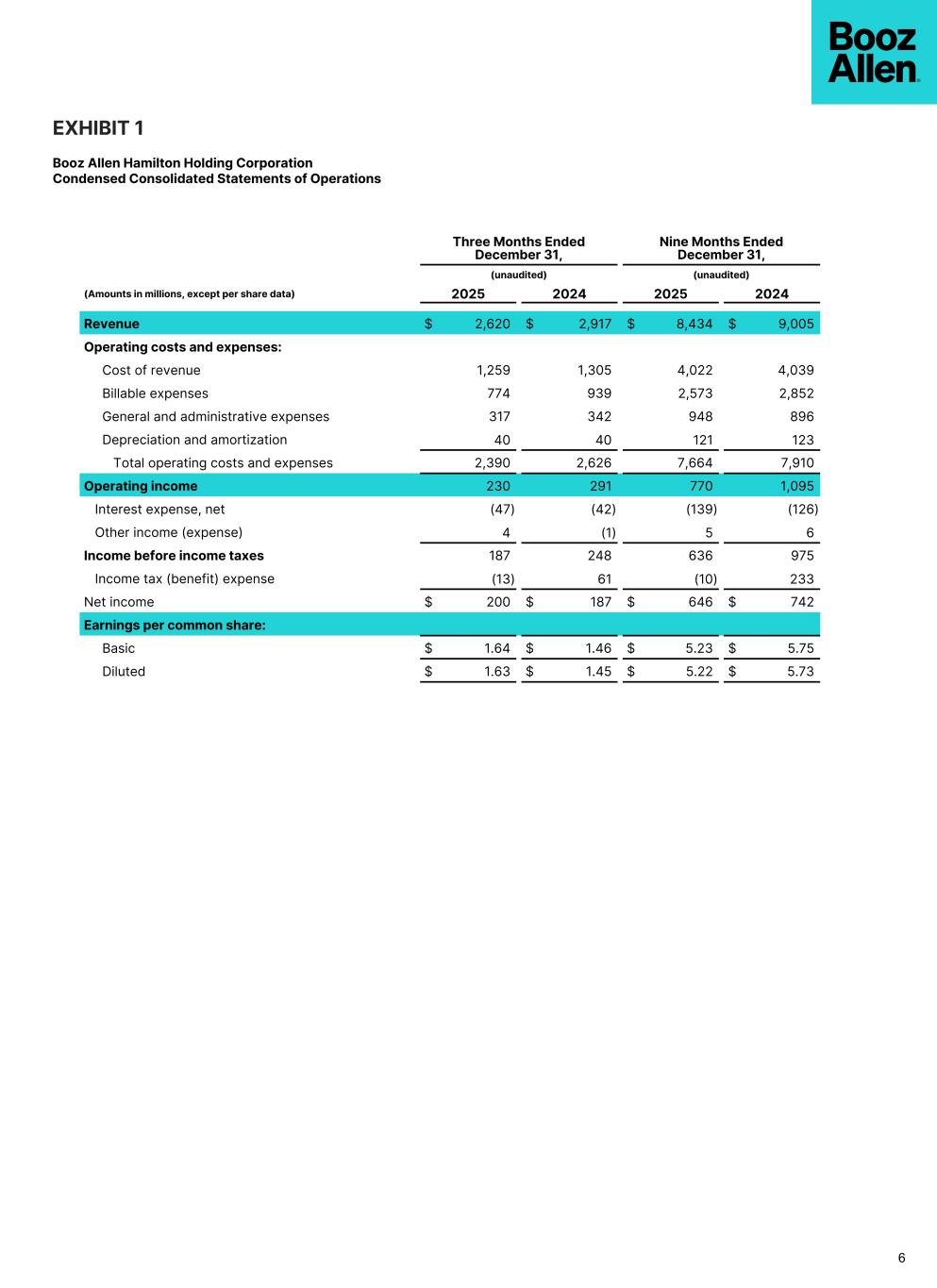 EXHIBIT 1 Booz Allen Hamilton Holding Corporation Condensed Consolidated Statements of Operations 6 Three Months Ended December 31, Nine Months Ended December 31, (unaudited) (unaudited) (Amounts in millions, except per share data) 2025 2024 2025 2024 Revenue $ 2,620 $ 2,917 $ 8,434 $ 9,005 Operating costs and expenses: Cost of revenue 1,259 1,305 4,022 4,039 Billable expenses 774 939 2,573 2,852 General and administrative expenses 317 342 948 896 Depreciation and amortization 40 40 121 123 Total operating costs and expenses 2,390 2,626 7,664 7,910 Operating income 230 291 770 1,095 Interest expense, net (47) (42) (139) (126) Other income (expense) 4 (1) 5 6 Income before income taxes 187 248 636 975 Income tax (benefit) expense (13) 61 (10) 233 Net income $ 200 $ 187 $ 646 $ 742 Earnings per common share: Basic $ 1.64 $ 1.46 $ 5.23 $ 5.75 Diluted $ 1.63 $ 1.45 $ 5.22 $ 5.73
