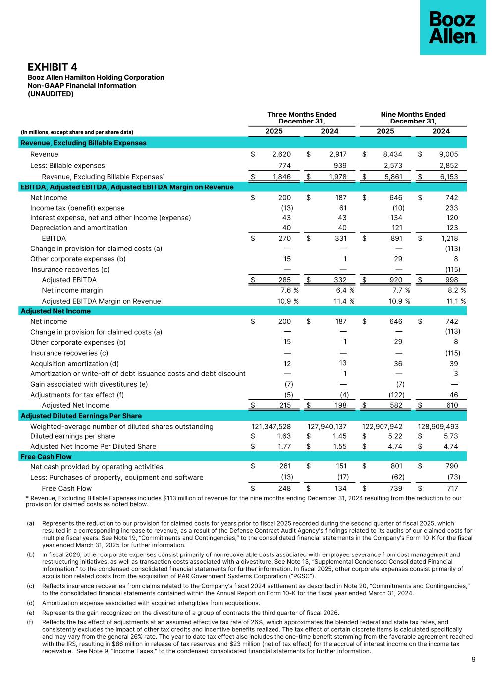 EXHIBIT 4 Booz Allen Hamilton Holding Corporation Non-GAAP Financial Information (UNAUDITED) Three Months Ended December 31, Nine Months Ended December 31, (In millions, except share and per share data) 2025 2024 2025 2024 Revenue, Excluding Billable Expenses Revenue $ 2,620 $ 2,917 $ 8,434 $ 9,005 Less: Billable expenses 774 939 2,573 2,852 Revenue, Excluding Billable Expenses* $ 1,846 $ 1,978 $ 5,861 $ 6,153 EBITDA, Adjusted EBITDA, Adjusted EBITDA Margin on Revenue Net income $ 200 $ 187 $ 646 $ 742 Income tax (benefit) expense (13) 61 (10) 233 Interest expense, net and other income (expense) 43 43 134 120 Depreciation and amortization 40 40 121 123 EBITDA $ 270 $ 331 $ 891 $ 1,218 Change in provision for claimed costs (a) — — — (113) Other corporate expenses (b) 15 1 29 8 Insurance recoveries (c) — — — (115) Adjusted EBITDA $ 285 $ 332 $ 920 $ 998 Net income margin 7.6 % 6.4 % 7.7 % 8.2 % Adjusted EBITDA Margin on Revenue 10.9 % 11.4 % 10.9 % 11.1 % Adjusted Net Income Net income $ 200 $ 187 $ 646 $ 742 Change in provision for claimed costs (a) — — — (113) Other corporate expenses (b) 15 1 29 8 Insurance recoveries (c) — — — (115) Acquisition amortization (d) 12 13 36 39 Amortization or write-off of debt issuance costs and debt discount — 1 — 3 Gain associated with divestitures (e) (7) — (7) — Adjustments for tax effect (f) (5) (4) (122) 46 Adjusted Net Income $ 215 $ 198 $ 582 $ 610 Adjusted Diluted Earnings Per Share Weighted-average number of diluted shares outstanding 121,347,528 127,940,137 122,907,942 128,909,493 Diluted earnings per share $ 1.63 $ 1.45 $ 5.22 $ 5.73 Adjusted Net Income Per Diluted Share $ 1.77 $ 1.55 $ 4.74 $ 4.74 Free Cash Flow Net cash provided by operating activities $ 261 $ 151 $ 801 $ 790 Less: Purchases of property, equipment and software (13) (17) (62) (73) Free Cash Flow $ 248 $ 134 $ 739 $ 717 * Revenue, Excluding Billable Expenses includes $113 million of revenue for the nine months ending December 31, 2024 resulting from the reduction to our provision for claimed costs as noted below. 9 (a) Represents the reduction to our provision for claimed costs for years prior to fiscal 2025 recorded during the second quarter of fiscal 2025, which resulted in a corresponding increase to revenue, as a result of the Defense Contract Audit Agency's findings related to its audits of our claimed costs for multiple fiscal years. See Note 19, “Commitments and Contingencies,” to the consolidated financial statements in the Company's Form 10-K for the fiscal year ended March 31, 2025 for further information. (b) In fiscal 2026, other corporate expenses consist primarily of nonrecoverable costs associated with employee severance from cost management and restructuring initiatives, as well as transaction costs associated with a divestiture. See Note 13, “Supplemental Condensed Consolidated Financial Information,” to the condensed consolidated financial statements for further information. In fiscal 2025, other corporate expenses consist primarily of acquisition related costs from the acquisition of PAR Government Systems Corporation (“PGSC”). (c) Reflects insurance recoveries from claims related to the Company’s fiscal 2024 settlement as described in Note 20, “Commitments and Contingencies,” to the consolidated financial statements contained within the Annual Report on Form 10-K for the fiscal year ended March 31, 2024. (d) Amortization expense associated with acquired intangibles from acquisitions. (e) Represents the gain recognized on the divestiture of a group of contracts the third quarter of fiscal 2026. (f) Reflects the tax effect of adjustments at an assumed effective tax rate of 26%, which approximates the blended federal and state tax rates, and consistently excludes the impact of other tax credits and incentive benefits realized. The tax effect of certain discrete items is calculated specifically and may vary from the general 26% rate. The year to date tax effect also includes the one-time benefit stemming from the favorable agreement reached with the IRS, resulting in $86 million in release of tax reserves and $23 million (net of tax effect) for the accrual of interest income on the income tax receivable. See Note 9, "Income Taxes," to the condensed consolidated financial statements for further information.