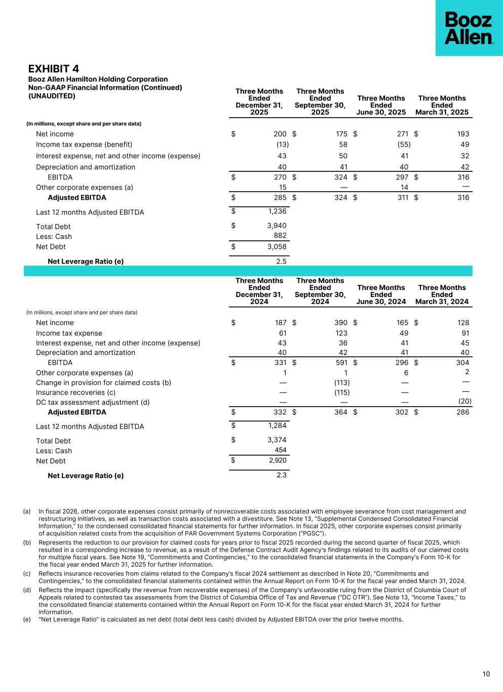 EXHIBIT 4 Booz Allen Hamilton Holding Corporation Non-GAAP Financial Information (Continued) (UNAUDITED) Three Months Ended December 31, 2025 Three Months Ended September 30, 2025 Three Months Ended June 30, 2025 Three Months Ended March 31, 2025 (In millions, except share and per share data) Net income $ 200 $ 175 $ 271 $ 193 Income tax expense (benefit) (13) 58 (55) 49 Interest expense, net and other income (expense) 43 50 41 32 Depreciation and amortization 40 41 40 42 EBITDA $ 270 $ 324 $ 297 $ 316 Other corporate expenses (a) 15 — 14 — Adjusted EBITDA $ 285 $ 324 $ 311 $ 316 Last 12 months Adjusted EBITDA $ 1,236 Total Debt $ 3,940 Less: Cash 882 Net Debt $ 3,058 Net Leverage Ratio (e) 2.5 Three Months Ended December 31, 2024 Three Months Ended September 30, 2024 Three Months Ended June 30, 2024 Three Months Ended March 31, 2024 (In millions, except share and per share data) Net income $ 187 $ 390 $ 165 $ 128 Income tax expense 61 123 49 91 Interest expense, net and other income (expense) 43 36 41 45 Depreciation and amortization 40 42 41 40 EBITDA $ 331 $ 591 $ 296 $ 304 Other corporate expenses (a) 1 1 6 2 Change in provision for claimed costs (b) — (113) — — Insurance recoveries (c) — (115) — — DC tax assessment adjustment (d) — — — (20) Adjusted EBITDA $ 332 $ 364 $ 302 $ 286 Last 12 months Adjusted EBITDA $ 1,284 Total Debt $ 3,374 Less: Cash 454 Net Debt $ 2,920 Net Leverage Ratio (e) 2.3 10 (a) In fiscal 2026, other corporate expenses consist primarily of nonrecoverable costs associated with employee severance from cost management and restructuring initiatives, as well as transaction costs associated with a divestiture. See Note 13, “Supplemental Condensed Consolidated Financial Information,” to the condensed consolidated financial statements for further information. In fiscal 2025, other corporate expenses consist primarily of acquisition related costs from the acquisition of PAR Government Systems Corporation (“PGSC”). (b) Represents the reduction to our provision for claimed costs for years prior to fiscal 2025 recorded during the second quarter of fiscal 2025, which resulted in a corresponding increase to revenue, as a result of the Defense Contract Audit Agency's findings related to its audits of our claimed costs for multiple fiscal years. See Note 19, “Commitments and Contingencies,” to the consolidated financial statements in the Company's Form 10-K for the fiscal year ended March 31, 2025 for further information. (c) Reflects insurance recoveries from claims related to the Company’s fiscal 2024 settlement as described in Note 20, “Commitments and Contingencies,” to the consolidated financial statements contained within the Annual Report on Form 10-K for the fiscal year ended March 31, 2024. (d) Reflects the impact (specifically the revenue from recoverable expenses) of the Company's unfavorable ruling from the District of Columbia Court of Appeals related to contested tax assessments from the District of Columbia Office of Tax and Revenue (“DC OTR”). See Note 13, “Income Taxes,” to the consolidated financial statements contained within the Annual Report on Form 10-K for the fiscal year ended March 31, 2024 for further information. (e) "Net Leverage Ratio" is calculated as net debt (total debt less cash) divided by Adjusted EBITDA over the prior twelve months.