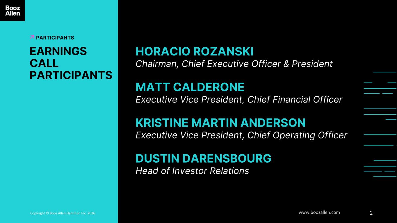 2Copyright © Booz Allen Hamilton Inc. 2025 www.boozallen.com6 PARTICIPANTS EARNINGS CALL PARTICIPANTS HORACIO ROZANSKI Chairman, Chief Executive Officer & President MATT CALDERONE Executive Vice President, Chief Financial Officer KRISTINE MARTIN ANDERSON Executive Vice President, Chief Operating Officer DUSTIN DARENSBOURG Head of Investor Relations
