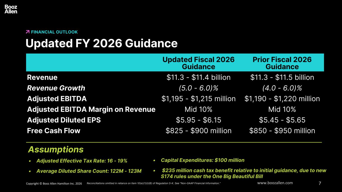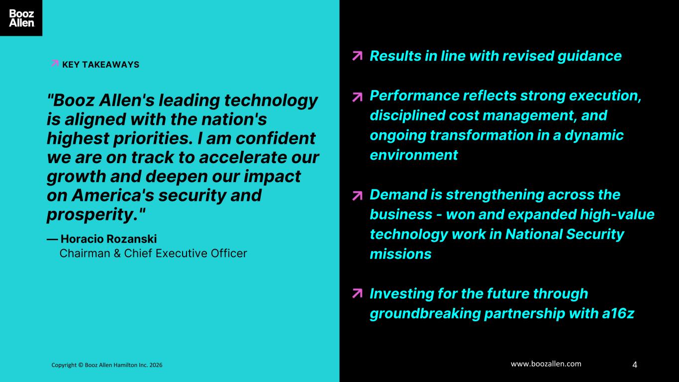3Copyright © Booz Allen Hamilton Inc. 2025 www.boozallen.com Booz Allen Hamilton Restricted Disclaimer DISCLAIMER 6 Forward Looking Safe Harbor Statement Certain statements contained in this presentation and in related comments by our management include “forward-looking statements” within the meaning of the Private Securities Litigation Reform Act of 1995. Examples of forward- looking statements include information concerning Booz Allen’s preliminary financial results, financial outlook and guidance, including forecasted revenue, Adjusted EBITDA, Diluted EPS, Adjusted Diluted EPS, future quarterly dividends, and future improvements in operating margins, as well as any other statement that does not directly relate to any historical or current fact. In some cases, you can identify forward-looking statements by terminology such as “may,” “will,” “could,” “should,” “forecasts,” “expects,” “intends,” “plans,” “anticipates,” “projects,” “outlook,” “believes,” “estimates,” “predicts,” “potential,” “continue,” “preliminary,” or the negative of these terms or other comparable terminology. Although we believe that the expectations reflected in the forward-looking statements are reasonable, we can give you no assurance these expectations will prove to have been correct. These forward-looking statements relate to future events or our future financial performance and involve known and unknown risks, uncertainties and other factors that may cause our actual results, levels of activity, performance or achievements to differ materially from any future results, levels of activity, performance or achievements expressed or implied by these forward-looking statements. A number of important factors could cause actual results to differ materially from those contained in or implied by these forward-looking statements, including those factors discussed in our filings with the Securities and Exchange Commission (SEC), including our Annual Report on Form 10-K for the fiscal year ended March 31, 2025, which can be found at the SEC’s website at www.sec.gov. All forward-looking statements attributable to us or persons acting on our behalf are expressly qualified in their entirety by the foregoing cautionary statements. All such statements speak only as of the date made and, except as required by law, we undertake no obligation to update or revise publicly any forward-looking statements, whether as a result of new information, future events or otherwise. Booz Allen’s fiscal year ends on March 31 and unless otherwise noted, references to fiscal year, fiscal or FY are for fiscal years ended March 31. Note Regarding Non-GAAP Financial Data Information Booz Allen discloses Revenue, Excluding Billable Expenses, Adjusted EBITDA, Adjusted EBITDA Margin on Revenue, Adjusted Net Income, Adjusted Diluted EPS, Free Cash Flow, and Net Leverage Ratio, which are not recognized measurements under accounting principles generally accepted in the United States, or GAAP, and when analyzing Booz Allen’s performance or liquidity as applicable, investors should (i) evaluate each adjustment in our reconciliation of revenue to Revenue, Excluding Billable Expenses, net income attributable to common stockholders to Adjusted EBITDA, Adjusted EBITDA Margin on Revenue, Adjusted Net Income and Adjusted Diluted EPS, net cash used in operating activities to Free Cash Flow, and net debt to Net Leverage Ratio, and the explanatory footnotes regarding those adjustments, each as defined under GAAP, (ii) use Revenue, Excluding Billable Expenses, Adjusted EBITDA, Adjusted EBITDA Margin on Revenue, Adjusted Net Income, and Adjusted Diluted EPS in addition to, and not as an alternative to, revenue, operating income, net income attributable to common stockholders or diluted EPS as measures of operating results, each as defined under GAAP, (iii) use Free Cash Flow in addition to, and not as an alternative to, net cash used in operating activities as a measure of liquidity, each as defined under GAAP, and (iv) use Net Leverage Ratio in addition to, and not as an alternative to, net debt as a measure of Booz Allen's debt leverage. The Appendix includes a reconciliation of Revenue, Excluding Billable Expenses, Adjusted EBITDA, Adjusted EBITDA Margin on Revenue, Adjusted Net Income, Adjusted Diluted EPS, Free Cash Flow and Net Leverage Ratio to the most directly comparable financial measure calculated and presented in accordance with GAAP. Booz Allen presents these supplemental performance measures because it believes that these measures provide investors and securities analysts with important supplemental information with which to evaluate Booz Allen’s performance, long term earnings potential, or liquidity, as applicable, and to enable them to assess Booz Allen’s performance on the same basis as management. These supplemental performance and liquidity measurements may vary from and may not be comparable to similarly titled measures by other companies in Booz Allen’s industry.   With respect to our expectations under “Financial Outlook", reconciliation of Adjusted Diluted EPS guidance, Adjusted EBITDA, and Adjusted EBITDA Margin on Revenue, and Adjusted Effective Tax Rate to the closest corresponding GAAP measure is not available without unreasonable efforts on a forward-looking basis due to our inability to predict our stock price, equity grants and dividend declarations with respect to Adjusted Diluted EPS, and our net income, net interest and other expenses with respect to Adjusted EBITDA, Adjusted EBITDA Margin on Revenue, and Adjusted Effective Tax Rate, during the course of fiscal 2026. With respect to Adjusted Diluted EPS guidance, projecting future stock price, equity grants and dividends to be declared would be necessary to accurately calculate the difference between Adjusted Diluted EPS and GAAP EPS as a result of the effects of the two-class method and related po