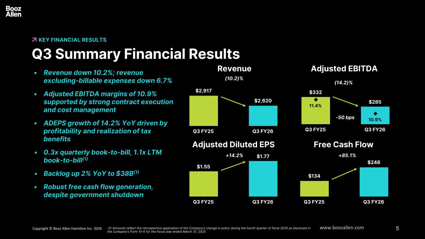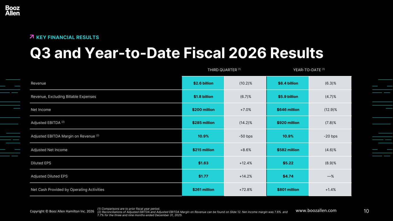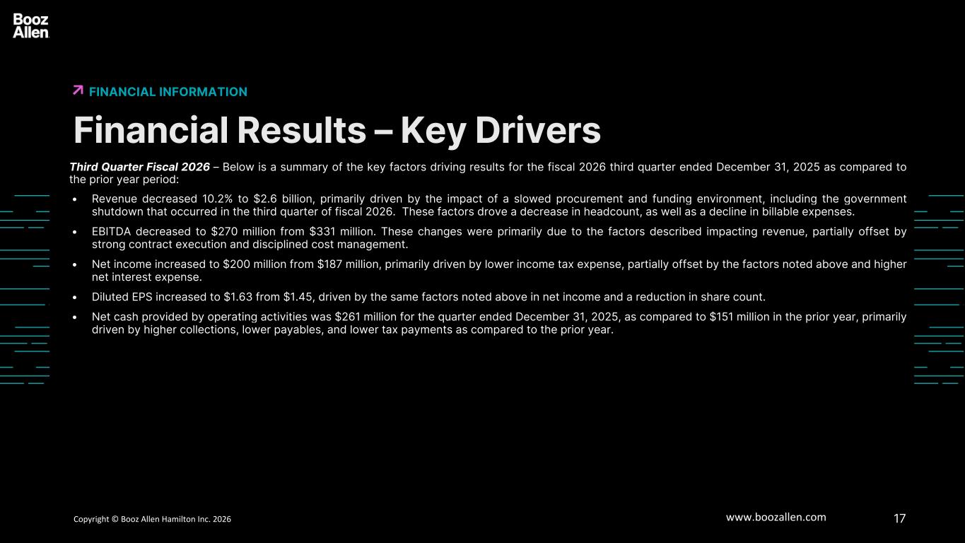 17Copyright © Booz Allen Hamilton Inc. 2025 www.boozallen.com Booz Allen Hamilton Restricted Financial Results – Key Drivers FINANCIAL INFORMATION 6 Third Quarter Fiscal 2026 – Below is a summary of the key factors driving results for the fiscal 2026 third quarter ended December 31, 2025 as compared to the prior year period: • Revenue decreased 10.2% to $2.6 billion, primarily driven by the impact of a slowed procurement and funding environment, including the government shutdown that occurred in the third quarter of fiscal 2026. These factors drove a decrease in headcount, as well as a decline in billable expenses. • EBITDA decreased to $270 million from $331 million. These changes were primarily due to the factors described impacting revenue, partially offset by strong contract execution and disciplined cost management. • Net income increased to $200 million from $187 million, primarily driven by lower income tax expense, partially offset by the factors noted above and higher net interest expense. • Diluted EPS increased to $1.63 from $1.45, driven by the same factors noted above in net income and a reduction in share count. • Net cash provided by operating activities was $261 million for the quarter ended December 31, 2025, as compared to $151 million in the prior year, primarily driven by higher collections, lower payables, and lower tax payments as compared to the prior year.