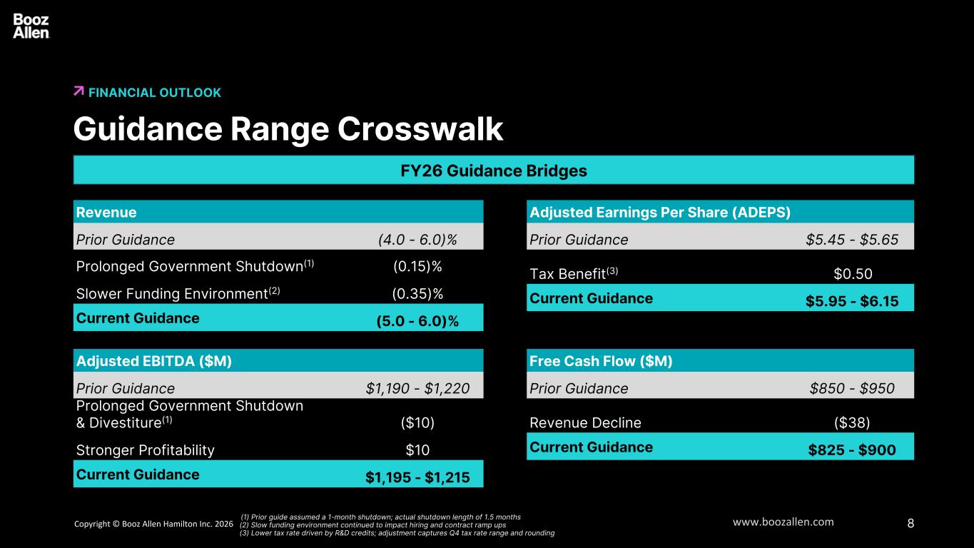 7Copyright © Booz Allen Hamilton Inc. 2025 www.boozallen.com FINANCIAL OUTLOOK Updated FY 2026 Guidance 6 Assumptions • Adjusted Effective Tax Rate: 16 - 19% • Average Diluted Share Count: 122M - 123M Reconciliations omitted in reliance on Item 10(e)(1)(i)(B) of Regulation S-K. See "Non-GAAP Financial Information." Updated Fiscal 2026 Guidance Prior Fiscal 2026 Guidance Revenue $11.3 - $11.4 billion $11.3 - $11.5 billion Revenue Growth (5.0 - 6.0)% (4.0 - 6.0)% Adjusted EBITDA $1,195 - $1,215 million $1,190 - $1,220 million Adjusted EBITDA Margin on Revenue Mid 10% Mid 10% Adjusted Diluted EPS $5.95 - $6.15 $5.45 - $5.65 Free Cash Flow $825 - $900 million $850 - $950 million • Capital Expenditures: $100 million • $235 million cash tax benefit relative to initial guidance, due to new S174 rules under the One Big Beautiful Bill