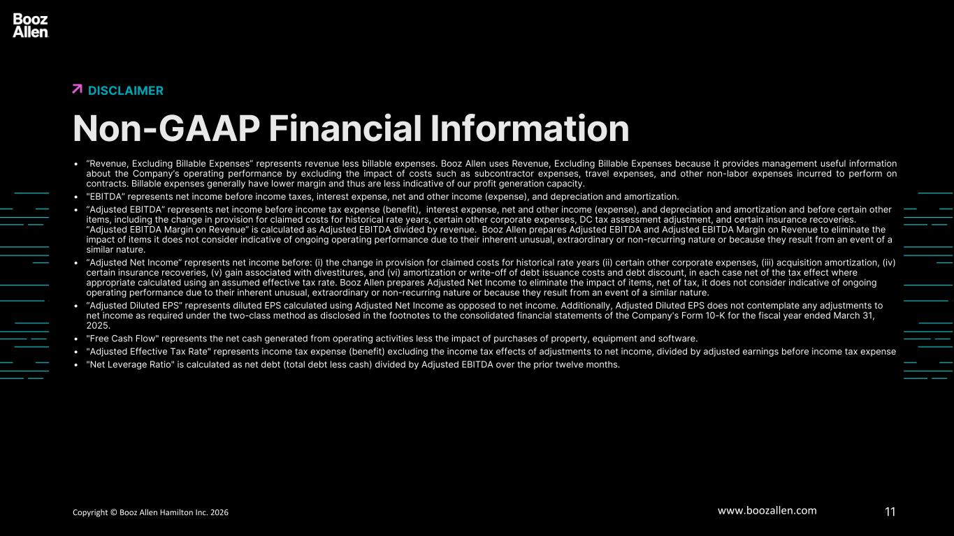 10Copyright © Booz Allen Hamilton Inc. 2025 www.boozallen.com THIRD QUARTER (1) YEAR-TO-DATE (1) Revenue $2.6 billion (10.2)% $8.4 billion (6.3)% Revenue, Excluding Billable Expenses $1.8 billion (6.7)% $5.9 billion (4.7)% Net Income $200 million +7.0% $646 million (12.9)% Adjusted EBITDA (2) $285 million (14.2)% $920 million (7.8)% Adjusted EBITDA Margin on Revenue (2) 10.9% -50 bps 10.9% -20 bps Adjusted Net Income $215 million +8.6% $582 million (4.6)% Diluted EPS $1.63 +12.4% $5.22 (8.9)% Adjusted Diluted EPS $1.77 +14.2% $4.74 —% Net Cash Provided by Operating Activities $261 million +72.8% $801 million +1.4% Booz Allen Hamilton Restricted Q3 and Year-to-Date Fiscal 2026 Results KEY FINANCIAL RESULTS 6 (1) Comparisons are to prior fiscal year period. (2) Reconciliations of Adjusted EBITDA and Adjusted EBITDA Margin on Revenue can be found on Slide 12. Net income margin was 7.6% and 7.7% for the three and nine months ended December 31, 2025.