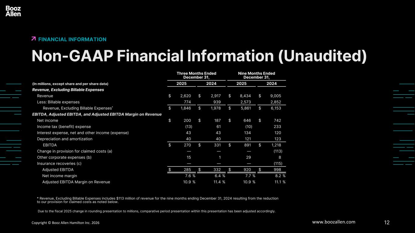 12Copyright © Booz Allen Hamilton Inc. 2025 www.boozallen.com Booz Allen Hamilton Restricted Non-GAAP Financial Information (Unaudited) FINANCIAL INFORMATION 6   Three Months Ended December 31, Nine Months Ended December 31, (In millions, except share and per share data) 2025 2024 2025 2024 Revenue, Excluding Billable Expenses Revenue $ 2,620 $ 2,917 $ 8,434 $ 9,005 Less: Billable expenses 774 939 2,573 2,852 Revenue, Excluding Billable Expenses* $ 1,846 $ 1,978 $ 5,861 $ 6,153 EBITDA, Adjusted EBITDA, and Adjusted EBITDA Margin on Revenue Net income $ 200 $ 187 $ 646 $ 742 Income tax (benefit) expense (13) 61 (10) 233 Interest expense, net and other income (expense) 43 43 134 120 Depreciation and amortization 40 40 121 123 EBITDA $ 270 $ 331 $ 891 $ 1,218 Change in provision for claimed costs (a) — — — (113) Other corporate expenses (b) 15 1 29 8 Insurance recoveries (c) — — — (115) Adjusted EBITDA $ 285 $ 332 $ 920 $ 998 Net income margin 7.6 % 6.4 % 7.7 % 8.2 % Adjusted EBITDA Margin on Revenue 10.9 % 11.4 % 10.9 % 11.1 % * Revenue, Excluding Billable Expenses includes $113 million of revenue for the nine months ending December 31, 2024 resulting from the reduction to our provision for claimed costs as noted below. Due to the fiscal 2025 change in rounding presentation to millions, comparative period presentation within this presentation has been adjusted accordingly.