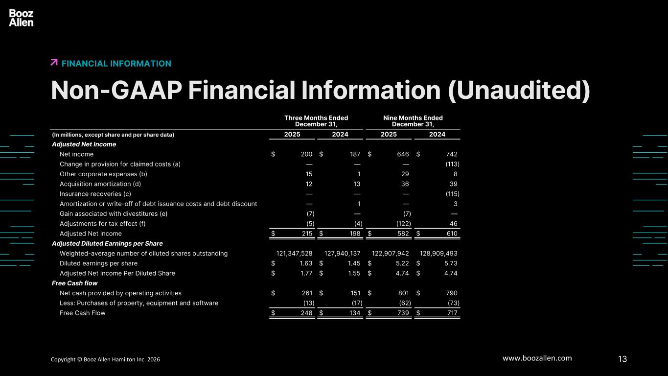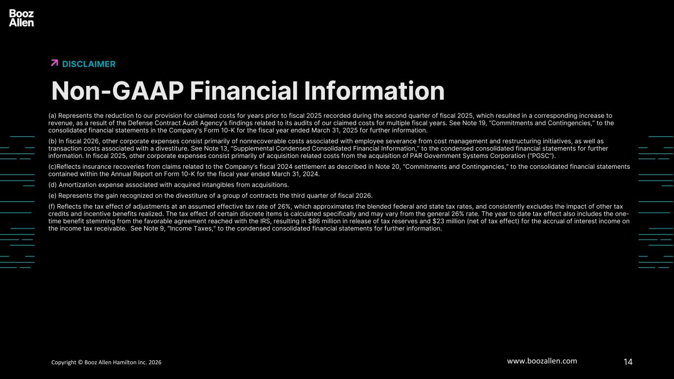 13Copyright © Booz Allen Hamilton Inc. 2025 www.boozallen.com Booz Allen Hamilton Restricted Non-GAAP Financial Information (Unaudited) FINANCIAL INFORMATION 6   Three Months Ended December 31, Nine Months Ended December 31, (In millions, except share and per share data) 2025 2024 2025 2024 Adjusted Net Income Net income $ 200 $ 187 $ 646 $ 742 Change in provision for claimed costs (a) — — — (113) Other corporate expenses (b) 15 1 29 8 Acquisition amortization (d) 12 13 36 39 Insurance recoveries (c) — — — (115) Amortization or write-off of debt issuance costs and debt discount — 1 — 3 Gain associated with divestitures (e) (7) — (7) — Adjustments for tax effect (f) (5) (4) (122) 46 Adjusted Net Income $ 215 $ 198 $ 582 $ 610 Adjusted Diluted Earnings per Share Weighted-average number of diluted shares outstanding 121,347,528 127,940,137 122,907,942 128,909,493 Diluted earnings per share $ 1.63 $ 1.45 $ 5.22 $ 5.73 Adjusted Net Income Per Diluted Share $ 1.77 $ 1.55 $ 4.74 $ 4.74 Free Cash flow Net cash provided by operating activities $ 261 $ 151 $ 801 $ 790 Less: Purchases of property, equipment and software (13) (17) (62) (73) Free Cash Flow $ 248 $ 134 $ 739 $ 717