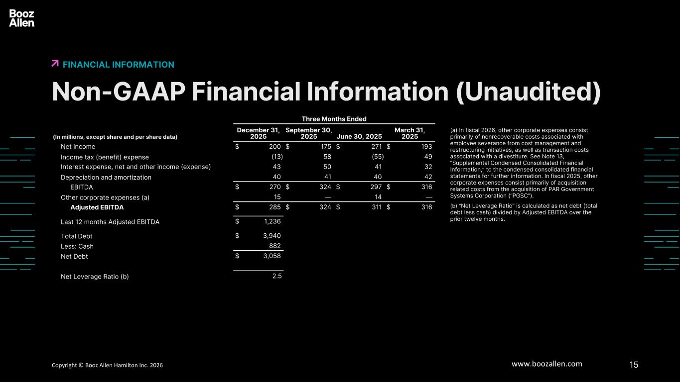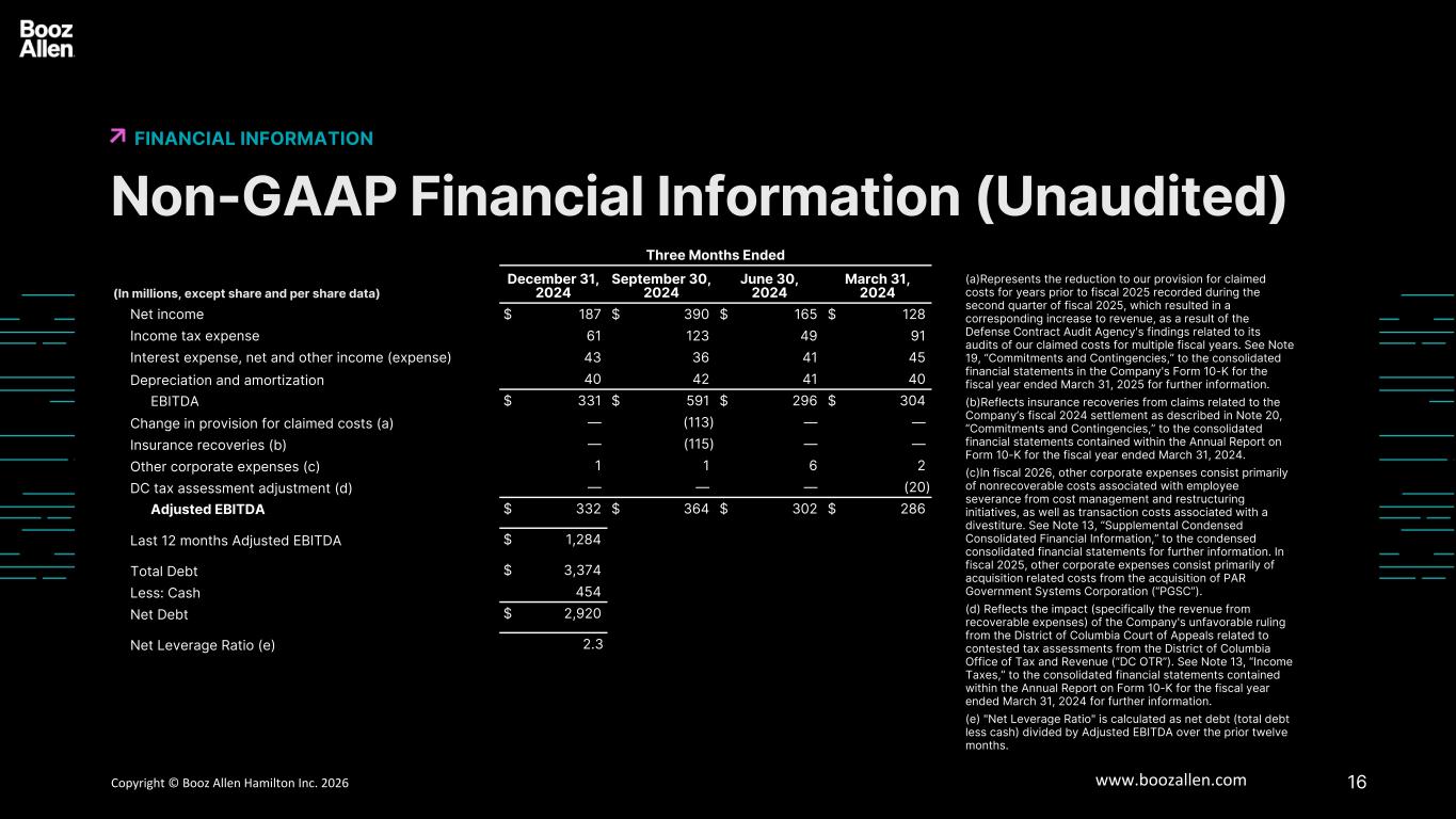 15Copyright © Booz Allen Hamilton Inc. 2025 www.boozallen.com Booz Allen Hamilton Restricted Non-GAAP Financial Information (Unaudited) FINANCIAL INFORMATION 6 (a) In fiscal 2026, other corporate expenses consist primarily of nonrecoverable costs associated with employee severance from cost management and restructuring initiatives, as well as transaction costs associated with a divestiture. See Note 13, “Supplemental Condensed Consolidated Financial Information,” to the condensed consolidated financial statements for further information. In fiscal 2025, other corporate expenses consist primarily of acquisition related costs from the acquisition of PAR Government Systems Corporation (“PGSC”). (b) "Net Leverage Ratio" is calculated as net debt (total debt less cash) divided by Adjusted EBITDA over the prior twelve months. Three Months Ended (In millions, except share and per share data) December 31, 2025 September 30, 2025 June 30, 2025 March 31, 2025 Net income $ 200 $ 175 $ 271 $ 193 Income tax (benefit) expense (13) 58 (55) 49 Interest expense, net and other income (expense) 43 50 41 32 Depreciation and amortization 40 41 40 42 EBITDA $ 270 $ 324 $ 297 $ 316 Other corporate expenses (a) 15 — 14 — Adjusted EBITDA $ 285 $ 324 $ 311 $ 316 Last 12 months Adjusted EBITDA $ 1,236 Total Debt $ 3,940 Less: Cash 882 Net Debt $ 3,058 Net Leverage Ratio (b) 2.5