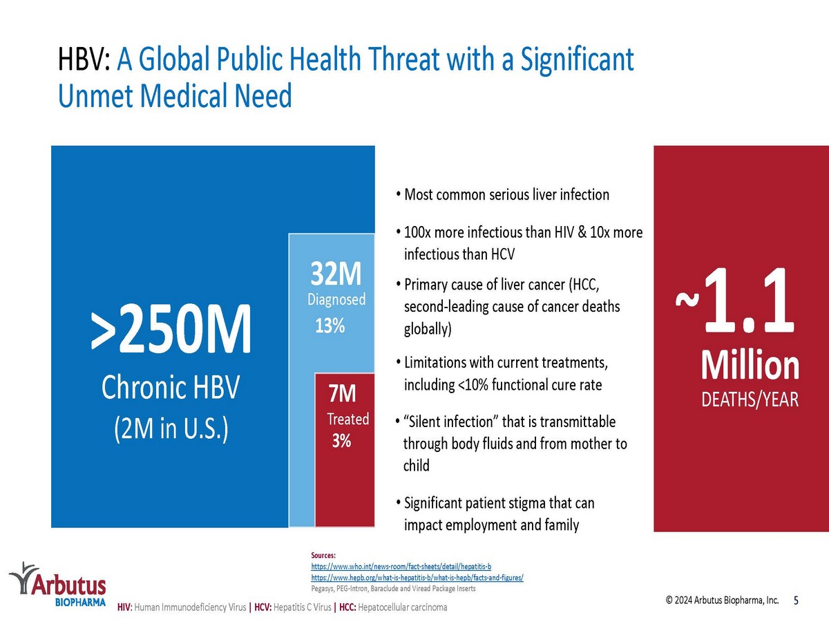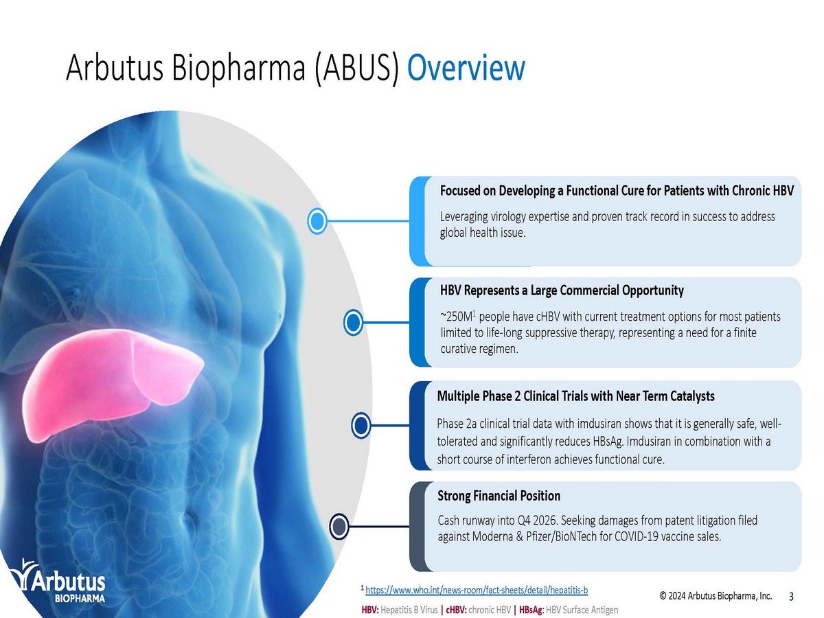 Forward - Looking Statements This presentation contains forward - looking statements within the meaning of the U . S . Private Securities Litigation Reform Act of 1995 and Canadian securities laws . All statements that are not historical facts are hereby identified as forward - looking statements for this purpose and include, among others, statements relating to : the potential market opportunity for HBV ; Arbutus’ ability to meet a significant unmet medical need ; the sufficiency of Arbutus’ cash and cash equivalents for the anticipated durations ; the expected cost, timing and results of Arbutus’ clinical development plans and clinical trials, including its clinical collaborations with third parties ; the potential for Arbutus’ product candidates to achieve their desired or anticipated outcomes ; Arbutus’ expectations regarding the timing and clinical development of Arbutus’ product candidates, including its articulated clinical objectives ; the timeline to a combination cure for HBV ; Arbutus’ expectations regarding its technology licensed to third parties ; the expected timing and payments associated with strategic and/or licensing agreements ; the patent infringement lawsuits ; and other statements relating to Arbutus’ future operations, future financial performance, future financial condition, prospects or other future events . With respect to the forward - looking statements contained in this presentation, Arbutus has made numerous assumptions regarding, among other things : the timely receipt of expected payments ; the effectiveness and timeliness of pre - clinical studies and clinical trials, and the usefulness of the data ; the timeliness of regulatory approvals ; the continued demand for Arbutus’ assets ; and the stability of economic and market conditions . While Arbutus considers these assumptions to be reasonable, these assumptions are inherently subject to significant business, economic, competitive, market and social uncertainties, and contingencies including uncertainties and contingencies related to patent litigation matters . Forward - looking statements herein involve known and unknown risks, uncertainties and other factors that may cause the actual results, events or developments to be materially different from any future results, events or developments expressed or implied by such forward - looking statements . Such factors include, among others : anticipated pre - clinical and clinical trials may be more costly or take longer to complete than anticipated, and may never be initiated or completed, or may not generate results that warrant future development of the tested drug candidate ; changes in Arbutus’ strategy regarding its product candidates and clinical development activities ; Arbutus may not receive the necessary regulatory approvals for the clinical development of Arbutus' products ; economic and market conditions may worsen ; uncertainties associated with litigation generally and patent litigation specifically ; market shifts may require a change in strategic focus ; and the parties may never realize the expected benefits of the collaborations . A more complete discussion of the risks and uncertainties facing Arbutus appears in Arbutus' Annual Report on Form 10 - K, Quarterly Report on Form 10 - Q and Arbutus' periodic disclosure filings, which are available at www . sec . gov and at www . sedar . com . All forward - looking statements herein are qualified in their entirety by this cautionary statement, and Arbutus disclaims any obligation to revise or update any such forward - looking statements or to publicly announce the result of any revisions to any of the forward - looking statements contained herein to reflect future results, events or developments, except as required by law . 2 © 2024 Arbutus Biopharma, Inc.