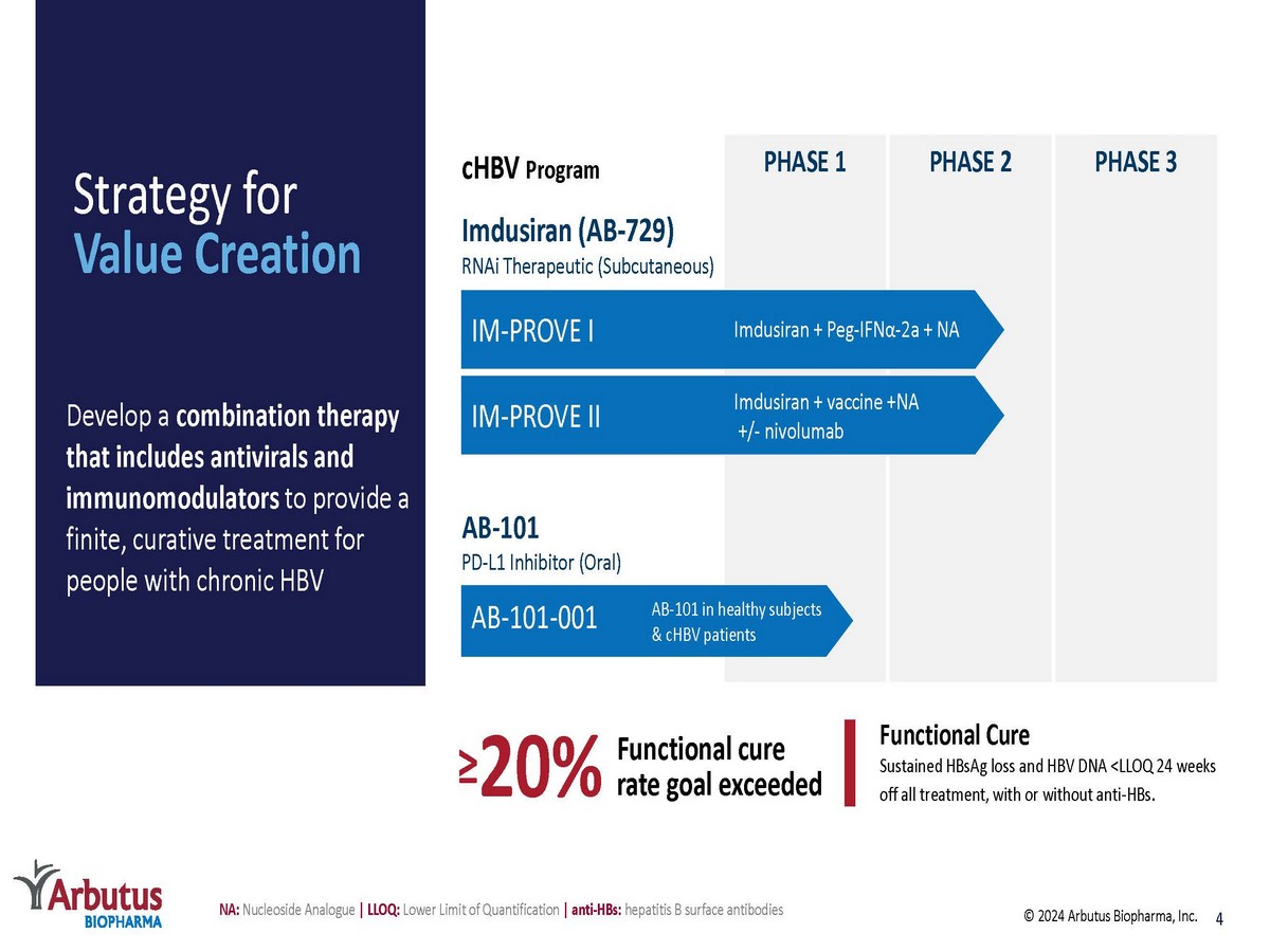 Arbutus Biopharma (ABUS) Overview ~250M 1 people have cHBV with current treatment options for most patients limited to life - long suppressive therapy, representing a need for a finite curative regimen. HBV Represents a Large Commercial Opportunity ` Phase 2a clinical trial data with imdusiran shows that it is generally safe, well - tolerated and significantly reduces HBsAg. Imdusiran in combination with a short course of interferon achieves functional cure. Multiple Phase 2 Clinical Trials with Near Term Catalysts Cash runway into Q4 2026. Seeking damages from patent litigation filed against Moderna & Pfizer/BioNTech for COVID - 19 vaccine sales. Strong Financial Position Leveraging virology expertise and proven track record in success to address global health issue. Focused on Developing a Functional Cure for Patients with Chronic HBV HBV: Hepatitis B Virus | cHBV : chronic HBV | HBsAg : HBV Surface Antigen 3 © 2024 Arbutus Biopharma, Inc. 1 https://www.who.int/news - room/fact - sheets/detail/hepatitis - b