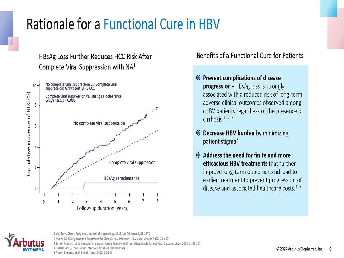 Chronic HBV (2M in U.S.) >250M HBV: A Global Public Health Threat with a Significant Unmet Medical Need Treated 7M 3% Diagnosed 32M 13% Sources: https://www.who.int/news - room/fact - sheets/detail/hepatitis - b https://www.hepb.org/what - is - hepatitis - b/what - is - hepb/facts - and - figures/ Pegasys , PEG - Intron, Baraclude and Viread Package Inserts 5 © 2024 Arbutus Biopharma, Inc. HIV : Human Immunodeficiency Virus | HCV: Hepatitis C Virus | HCC: Hepatocellular carcinoma • Most common serious liver infection • 100x more infectious than HIV & 10x more infectious than HCV • Primary cause of liver cancer (HCC, second - leading cause of cancer deaths globally ) • Limitations with current treatments, including <10% functional cure rate • “Silent infection” that is transmittable through body fluids and from mother to child • Significant patient stigma that can impact employment and family Million DEATHS/YEAR ~ 1.1