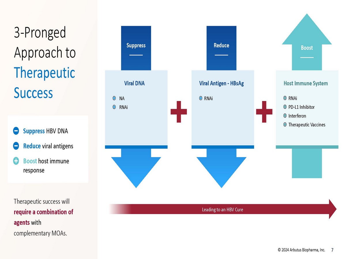 6 © 2024 Arbutus Biopharma, Inc. Rationale for a Functional Cure in HBV Prevent complications of disease progression - HBsAg loss is strongly associated with a reduced risk of long - term adverse clinical outcomes observed among cHBV patients regardless of the presence of cirrhosis. 1, 2, 3 Decrease HBV burden by minimizing patient stigma 3 Address the need for finite and more efficacious HBV treatments that further improve long - term outcomes and lead to earlier treatment to prevent progression of disease and associated healthcare costs. 4, 5 Benefits of a Functional Cure for Patients 1 Yip, Terry Cheuk - Fung et al, Journal of Hepatology, 2018; Vol 70, Issue 3, 361 - 370 2 Moini , M. HBsAg Loss as a Treatment for Chronic HBV Infection: HBV Cure. Viruses 2022 , 14, 657 3 Smith - Palmer J, et al. Impactof Stigma on People Living with ChronicHepatitis B.Patient RelatOutcomeMeas. 2020;11:95 - 107 4 Chahal, et al, Open Forum Infectious Diseases 2019 Jan; 61(1) 5 Razavi - Shearer, et al, J Viral Hepat. 2023; 00:1 - 9 HBsAg Loss Further Reduces HCC Risk After Complete Viral Suppression with NA 1