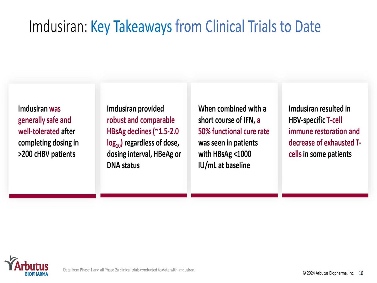 Proprietary GalNAc - conjugate delivery technology provides liver targeting and enables subcutaneous dosing Single trigger RNAi agent targeting all HBV transcripts Inhibits HBV replication and lowers all HBV antigens Pan - genotypic activity across HBV genotypes Demonstrated complementarity with other agents Actively targets the liver Active against cccDNA derived and integrated HBsAg transcripts Favorable profile in long term preclinical safety studies RNAi Therapeutic Imdusiran GalNAc n Linker Polymerase, Core Ag, eAg , pgRNA sAg sAg HBx 9 © 2024 Arbutus Biopharma, Inc.