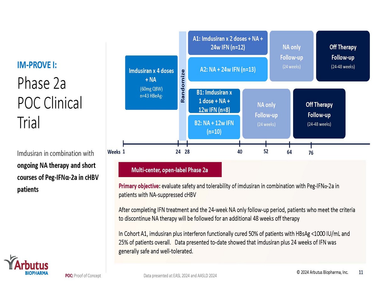 Imdusiran: Key Takeaways from Clinical Trials to Date Imdusiran provided robust and comparable HBsAg declines (~1.5 - 2.0 log 10 ) regardless of dose, dosing interval, HBeAg or DNA status When combined with a short course of IFN, a 50% functional cure rate was seen in patients with HBsAg <1000 IU/mL at baseline Imdusiran was generally safe and well - tolerated after completing dosing in >200 cHBV patients Imdusiran resulted in HBV - specific T - cell immune restoration and decrease of exhausted T - cells in some patients 10 © 2024 Arbutus Biopharma, Inc. Data from Phase 1 and all Phase 2a clinical trials conducted to date with imdusiran .