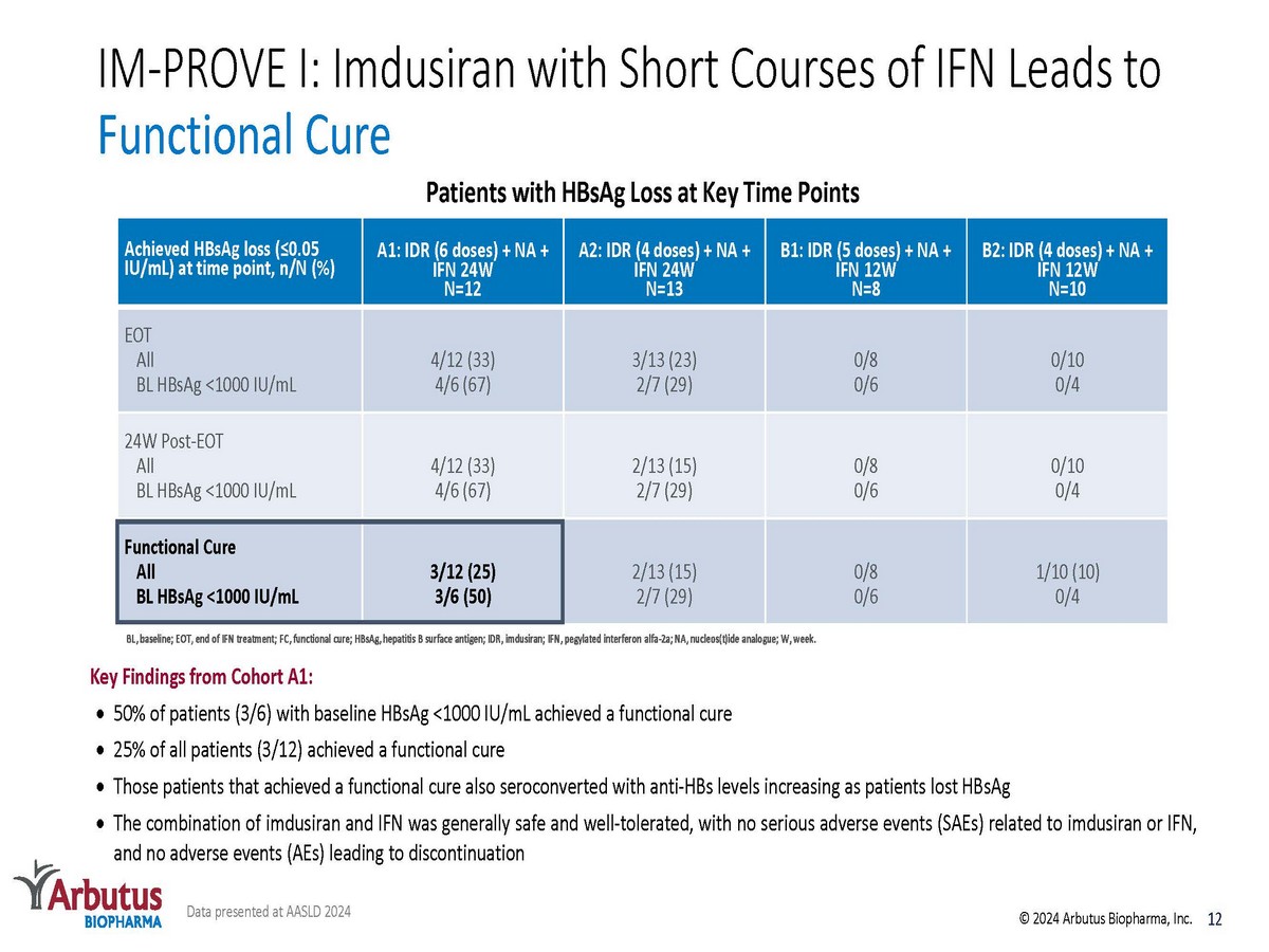 Phase 2a POC Clinical Trial Imdusiran in combination with ongoing NA therapy and short courses of Peg - IFN α - 2 a in cHBV patients IM - PROVE I: POC: Proof of Concept Primary objective : evaluate safety and tolerability of imdusiran in combination with Peg - IFN α - 2a in patients with NA - suppressed cHBV After completing IFN treatment and the 24 - week NA only follow - up period, patients who meet the criteria to discontinue NA therapy will be followed for an additional 48 weeks off therapy In Cohort A1, imdusiran plus interferon functionally cured 50% of patients with HBsAg <1000 IU/mL and 25% of patients overall. Data presented to - date showed that imdusiran plus 24 weeks of IFN was generally safe and well - tolerated. Multi - center, open - label Phase 2a 11 © 2024 Arbutus Biopharma, Inc. Weeks NA only Follow - up (24 weeks) A1: Imdusiran x 2 doses + NA + 24w IFN (n=12) A2: NA + 24w IFN (n=13) B1: Imdusiran x 1 dose + NA + 12w IFN (n=8) B2: NA + 12w IFN (n=10) Imdusiran x 4 doses + NA (60mg Q8W) n=43 HBeAg - Randomize NA only Follow - up (24 weeks) 1 52 28 24 40 Off Therapy Follow - up (24 - 48 weeks) Off Therapy Follow - up (24 - 48 weeks) 64 76 Data presented at EASL 2024 and AASLD 2024