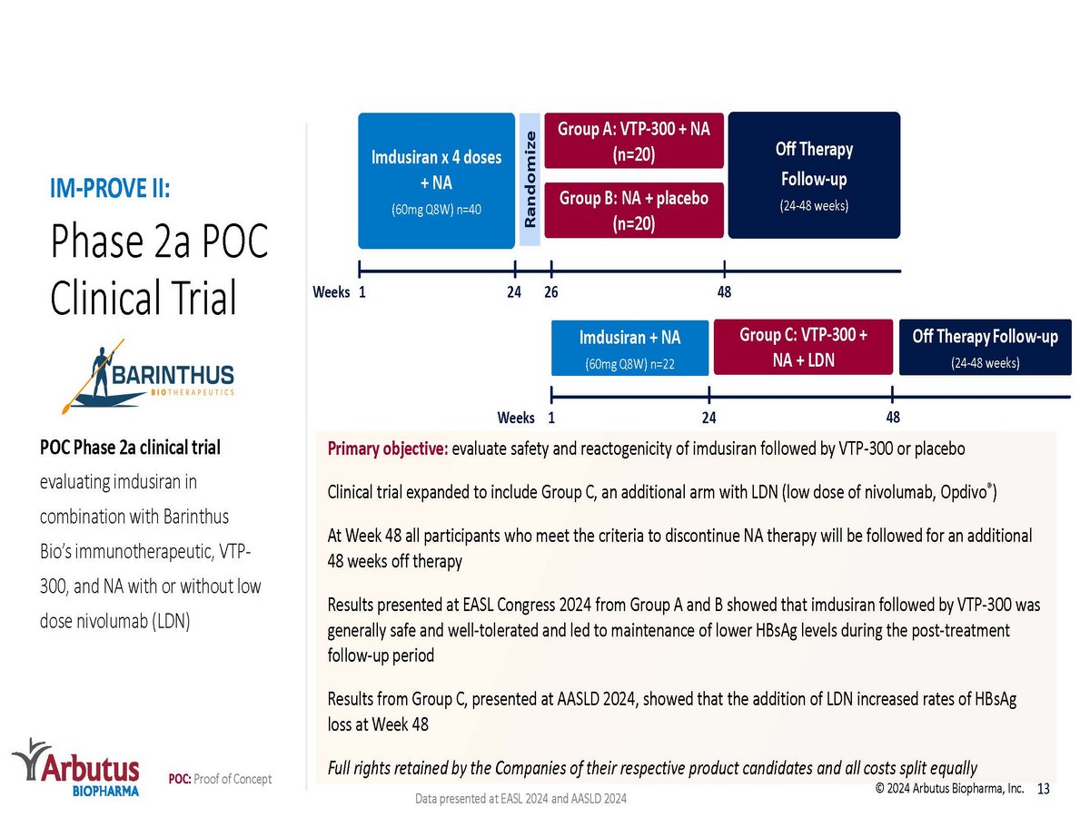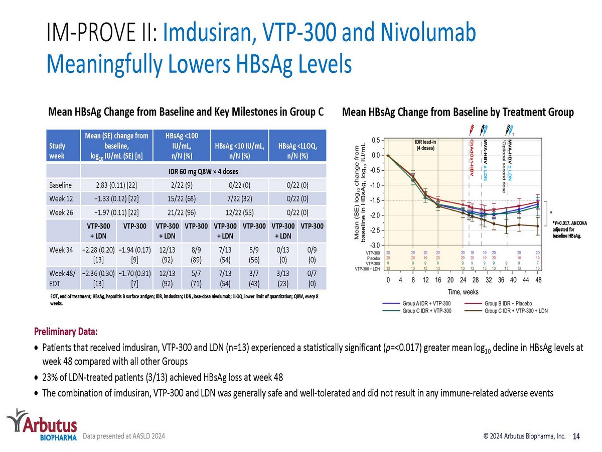 Phase 2a POC Clinical Trial POC Phase 2a clinical trial evaluating imdusiran in combination with Barinthus Bio’s immunotherapeutic, VTP - 300, and NA with or without low dose nivolumab (LDN) IM - PROVE II: Primary objective: evaluate safety and reactogenicity of imdusiran followed by VTP - 300 or placebo Clinical trial expanded to include Group C, an additional arm with LDN (low dose of nivolumab, Opdivo ® ) At Week 48 all participants who meet the criteria to discontinue NA therapy will be followed for an additional 48 weeks off therapy Results presented at EASL Congress 2024 from Group A and B showed that imdusiran followed by VTP - 300 was generally safe and well - tolerated and led to maintenance of lower HBsAg levels during the post - treatment follow - up period Results from Group C, presented at AASLD 2024, showed that the addition of LDN increased rates of HBsAg loss at Week 48 Full rights retained by the Companies of their respective product candidates and all costs split equally 13 Off Therapy Follow - up (24 - 48 weeks) Group A: VTP - 300 + NA (n=20) Group B: NA + placebo (n=20) 1 Imdusiran x 4 doses + NA (60mg Q8W) n=40 Randomize Weeks Imdusiran + NA (60mg Q8W) n=22 24 Group C: VTP - 300 + NA + LDN 1 48 26 24 Weeks 48 Off Therapy Follow - up (24 - 48 weeks) © 2024 Arbutus Biopharma, Inc. POC: Proof of Concept Data presented at EASL 2024 and AASLD 2024