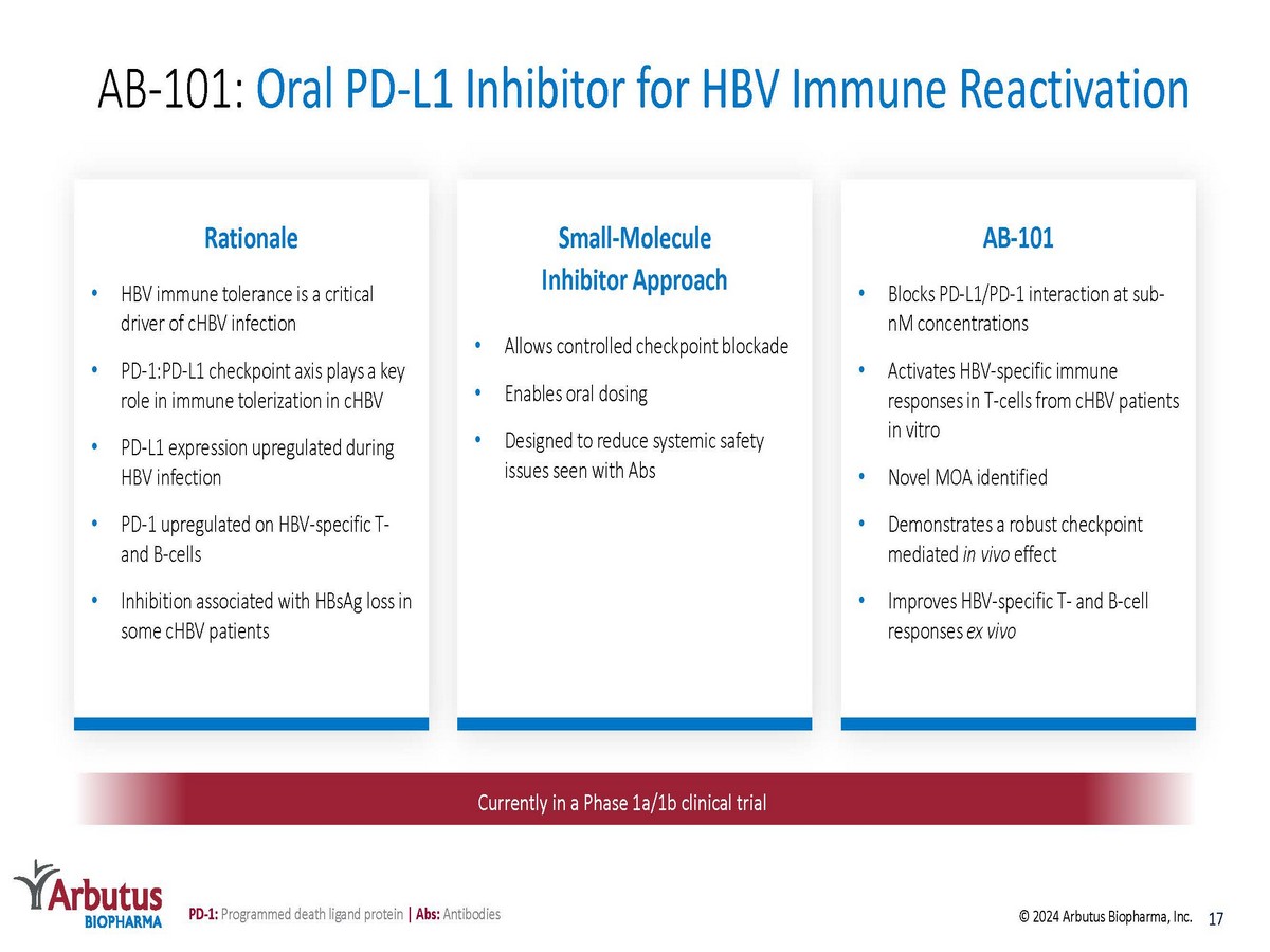 16 © 2024 Arbutus Biopharma, Inc. AB - 101 Oral PD - L1 Checkpoint Inhibitor