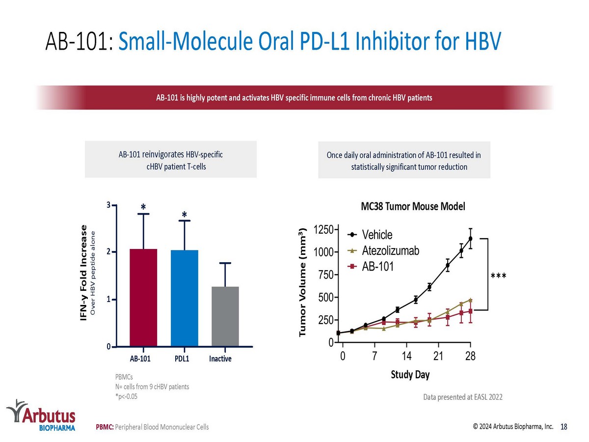 AB - 101: Oral PD - L1 Inhibitor for HBV Immune Reactivation PD - 1: Programmed death ligand protein | Abs: Antibodies Currently in a Phase 1a/1b clinical trial Rationale • HBV immune tolerance is a critical driver of cHBV infection • PD - 1:PD - L1 checkpoint axis plays a key role in immune tolerization in cHBV • PD - L1 expression upregulated during HBV infection • PD - 1 upregulated on HBV - specific T - and B - cells • Inhibition associated with HBsAg loss in some cHBV patients AB - 101 • Blocks PD - L1/PD - 1 interaction at sub - nM concentrations • Activates HBV - specific immune responses in T - cells from cHBV patients in vitro • Novel MOA identified • Demonstrates a robust checkpoint mediated in vivo effect • Improves HBV - specific T - and B - cell responses ex vivo Small - Molecule Inhibitor Approach • Allows controlled checkpoint blockade • Enables oral dosing • Designed to reduce systemic safety issues seen with Abs 17 © 2024 Arbutus Biopharma, Inc.