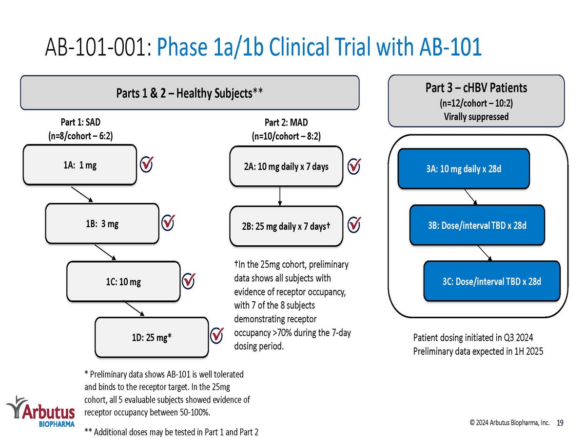 AB - 101: Small - Molecule Oral PD - L1 Inhibitor for HBV AB - 101 is highly potent and activates HBV specific immune cells from chronic HBV patients AB - 101 reinvigorates HBV - specific cHBV patient T - cells PBMCs N= cells from 9 cHBV patients *p< - 0.05 PBMC: P eripheral Blood Mononuclear Cells PDL1 * Inactive AB - 101 * 0 3 2 1 IFN - y Fold Increase Over HBV peptide alone 18 © 2024 Arbutus Biopharma, Inc. Once daily oral administration of AB - 101 resulted in statistically significant tumor reduction Study Day MC38 Tumor Mouse Model Tumor Volume (mm 3 ) Data presented at EASL 2022