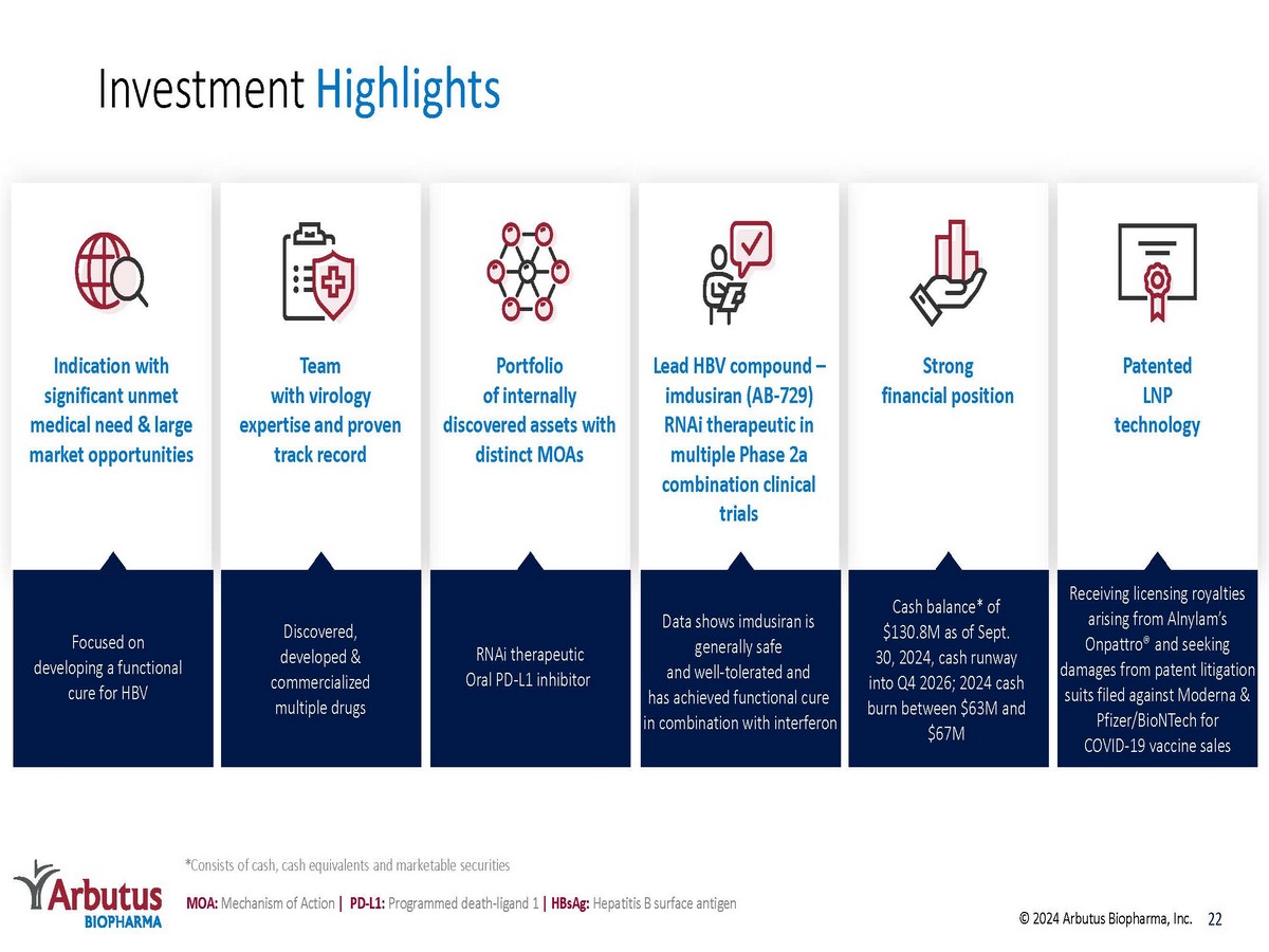 2024 Key Milestones 21 Timing 2024 Milestone 1H IM - PROVE I Phase 2a ( imdusiran + IFN): End - of - treatment data 1H IM - PROVE II Phase 2a ( imdusiran + VTP - 300): End - of - treatment data 1H AB - 101 - 001: Preliminary data from healthy subject cohorts 2H IM - PROVE II Phase 2a ( imdusiran + VTP - 300 + nivolumab): End - of - treatment data 2H AB - 101 - 001: Preliminary data from multiple - ascending dose healthy subject cohorts © 2024 Arbutus Biopharma, Inc.