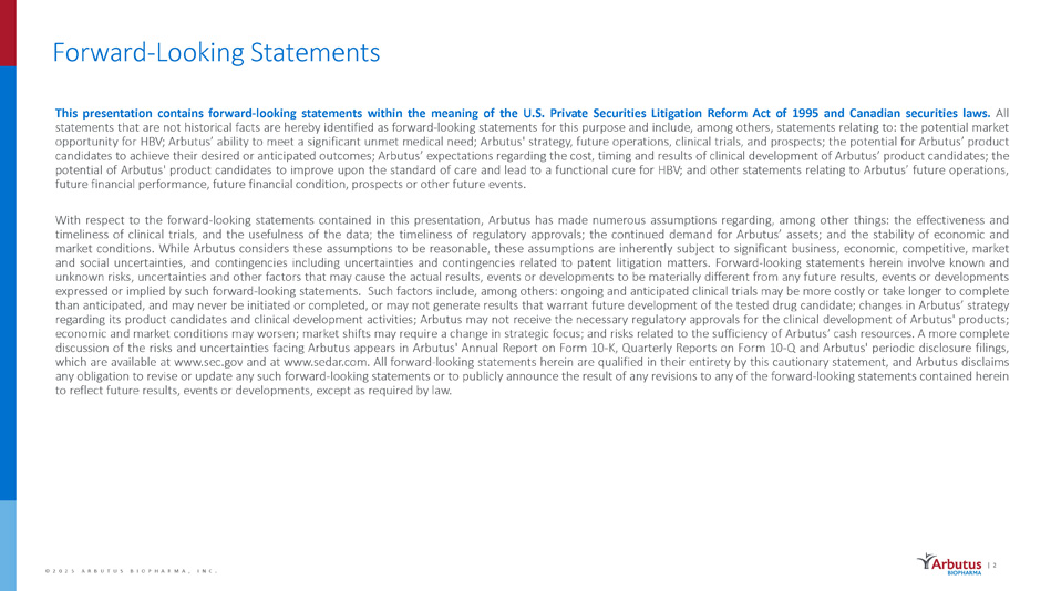 ©2025 ARBUTUS BIOPHARMA, INC . Forward - Looking Statements This presentation contains forward - looking statements within the meaning of the U . S . Private Securities Litigation Reform Act of 1995 and Canadian securities laws . All statements that are not historical facts are hereby identified as forward - looking statements for this purpose and include, among others, statements relating to : the potential market opportunity for HBV ; Arbutus’ ability to meet a significant unmet medical need ; Arbutus' strategy, future operations, clinical trials, and prospects ; the potential for Arbutus’ product candidates to achieve their desired or anticipated outcomes ; Arbutus’ expectations regarding the cost, timing and results of clinical development of Arbutus’ product candidates ; the potential of Arbutus' product candidates to improve upon the standard of care and lead to a functional cure for HBV ; and other statements relating to Arbutus’ future operations, future financial performance, future financial condition, prospects or other future events . With respect to the forward - looking statements contained in this presentation, Arbutus has made numerous assumptions regarding, among other things : the effectiveness and timeliness of clinical trials, and the usefulness of the data ; the timeliness of regulatory approvals ; the continued demand for Arbutus’ assets ; and the stability of economic and market conditions . While Arbutus considers these assumptions to be reasonable, these assumptions are inherently subject to significant business, economic, competitive, market and social uncertainties, and contingencies including uncertainties and contingencies related to patent litigation matters . Forward - looking statements herein involve known and unknown risks, uncertainties and other factors that may cause the actual results, events or developments to be materially different from any future results, events or developments expressed or implied by such forward - looking statements . Such factors include, among others : ongoing and anticipated clinical trials may be more costly or take longer to complete than anticipated, and may never be initiated or completed, or may not generate results that warrant future development of the tested drug candidate ; changes in Arbutus’ strategy regarding its product candidates and clinical development activities ; Arbutus may not receive the necessary regulatory approvals for the clinical development of Arbutus' products ; economic and market conditions may worsen ; market shifts may require a change in strategic focus ; and risks related to the sufficiency of Arbutus’ cash resources . A more complete discussion of the risks and uncertainties facing Arbutus appears in Arbutus' Annual Report on Form 10 - K, Quarterly Reports on Form 10 - Q and Arbutus' periodic disclosure filings, which are available at www . sec . gov and at www . sedar . com . All forward - looking statements herein are qualified in their entirety by this cautionary statement, and Arbutus disclaims any obligation to revise or update any such forward - looking statements or to publicly announce the result of any revisions to any of the forward - looking statements contained herein to reflect future results, events or developments, except as required by law . | 2