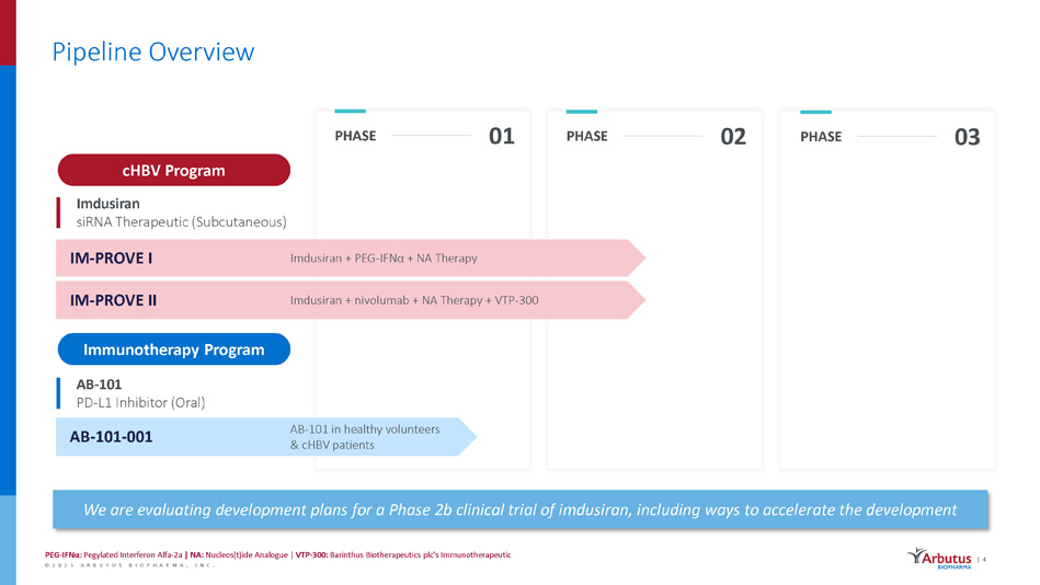 ©2025 ARBUTUS BIOPHARMA, INC . Arbutus Biopharma (ABUS) Overview | 3 Our team includes leaders with the deep scientific and development expertise needed to accelerate and strengthen our portfolio’s path to market HBV: Hepatitis B Virus | HBsAg : HBV Surface Antigen | HBV DNA : HBV Deoxyribonucleic Acid Focused on Developing a Functional Cure for Patients with Chronic Hepatitis B ( cHBV ) Cash and cash equivalents of $94M as of September 30, 2025 1. https://www.cdc.gov/hepatitis/global/index.html Strong Financial Position ~254M 1 people have cHBV , with current treatment options for most patients limited to lifelong non - curative therapy, representing a need for a finite curative regimen cHBV Represents a Large Commercial Opportunity Achieved Durable Viral Suppression with Imdusiran in Phase 2a, Including Multiple Functional Cures and Other Clinical Benefits Phase 2a clinical trial data shows imdusiran provides meaningful reductions in HBsAg and HBV DNA, and leads to functional cure and discontinuation of therapy in some patients, while being generally safe and well - tolerated