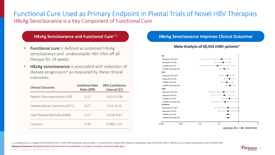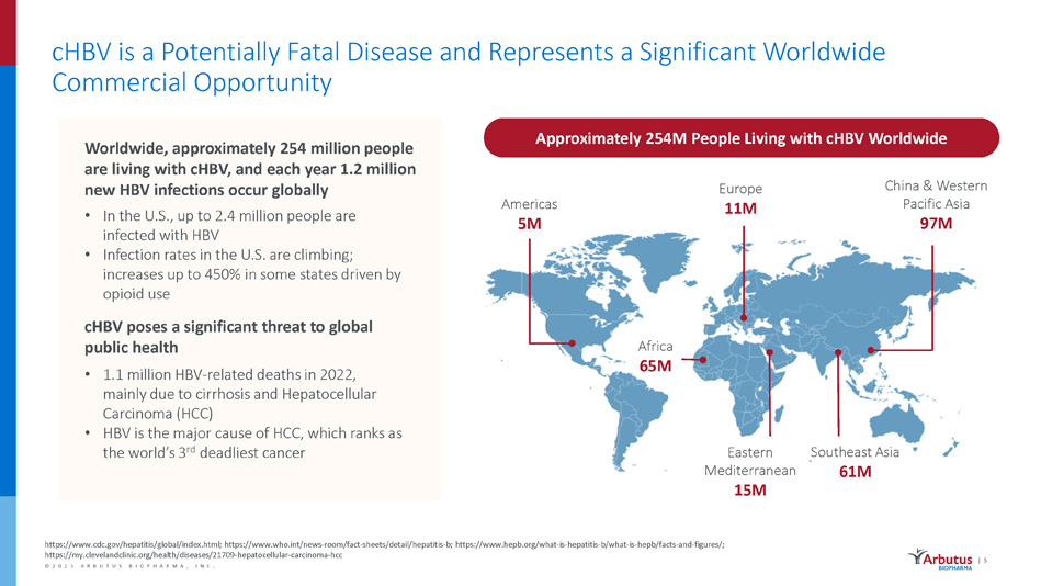 ©2025 ARBUTUS BIOPHARMA, INC . cHBV is a Potentially Fatal Disease and Represents a Significant Worldwide Commercial Opportunity | 5 https://www.cdc.gov/hepatitis/global/index.html; https://www.who.int/news - room/fact - sheets/detail/hepatitis - b; https://www.hepb. org/what - is - hepatitis - b/what - is - hepb/facts - and - figures/; https://my.clevelandclinic.org/health/diseases/21709 - hepatocellular - carcinoma - hcc Americas 5M Worldwide, approximately 254 million people are living with cHBV , and each year 1.2 million new HBV infections occur globally Approximately 254M People Living with cHBV Worldwide Europe 11M China & Western Pacific Asia 97M • In the U.S., up to 2.4 million people are infected with HBV • Infection rates in the U.S. are climbing; increases up to 450% in some states driven by opioid use Africa 65M • 1.1 million HBV - related deaths in 2022, mainly due to cirrhosis and Hepatocellular Carcinoma (HCC) • HBV is the major cause of HCC, which ranks as the world’s 3 rd deadliest cancer Eastern Mediterranean 15M Southeast Asia 61M cHBV poses a significant threat to global public health