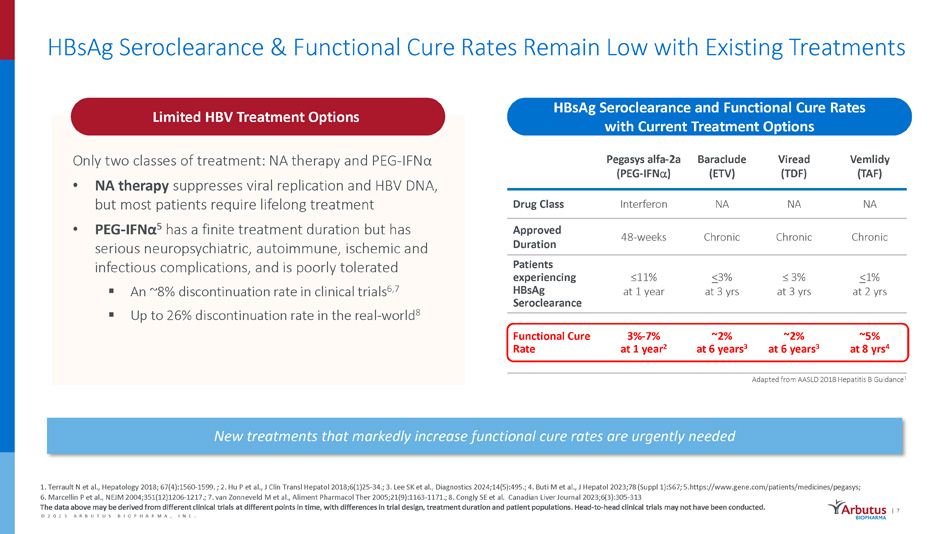 ©2025 ARBUTUS BIOPHARMA, INC . | 6 1. Cornberg M et al., J Hepatol 2020;72(3):539 - 557; 2. WHO HBV Guidelines, Geneva 2024; 3. Terrault N et al., AASLD HBV Guidance, Hepatology 2018; 67(4):1560 - 1599; 4. Morais E et al., Gastro Hep Advances 2023;2(7)992 - 1004 • Functional cure is defined as sustained HBsAg seroclearance and undetectable HBV DNA off all therapy for 24 weeks • HBsAg seroclearance is associated with reduction of disease progression 4 as measured by these clinical outcomes: 95% Confidence Interval (CI) Incidence Rate Ratio (IRR) Clinical Outcome 0.013 – 0.38 0.13 Hepatic Decompensation (HD) 0.11 – 0.53 0.27 Hepatocellular Carcinoma (HCC) 0.028 – 0.61 0.17 Liver - Related Mortality (LRM) 0.060 – 1.07 0.28 Cirrhosis LESS RISK MORE RISK Functional Cure Used as Primary Endpoint in Pivotal Trials of Novel HBV Therapies HBsAg Seroclearance is a Key Component of Functional Cure HBsAg Seroclearance Improves Clinical Outcomes Meta - Analysis of 50,354 cHBV patients 4 HBsAg Seroclearance : HBsAg levels below the lower limit of quantification, on at least 2 occasions at least 24 weeks apart HBsAg Seroclearance and Functional Cure 1 - 3